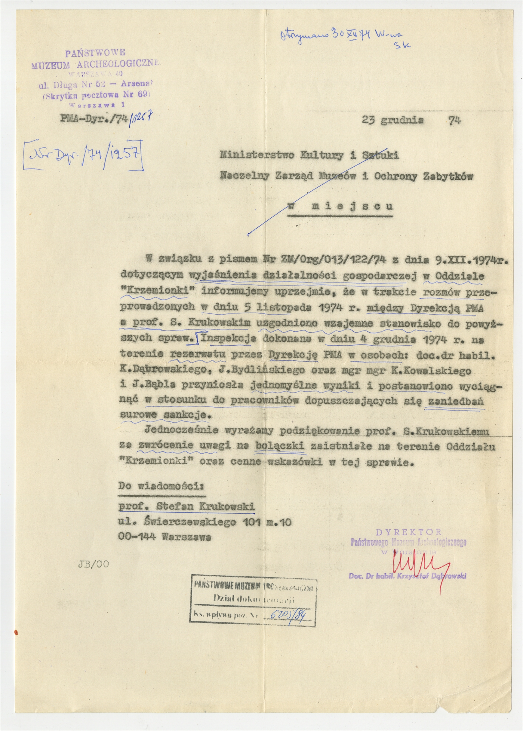 Maszynopis - list Państwowego Muzeum Archeologicznego w Warszawie do Ministerstwa Kultuy i Sztuki z dnia 23 grudnia [19]74 roku - kopia do wiadomości S. Krukowskiego.