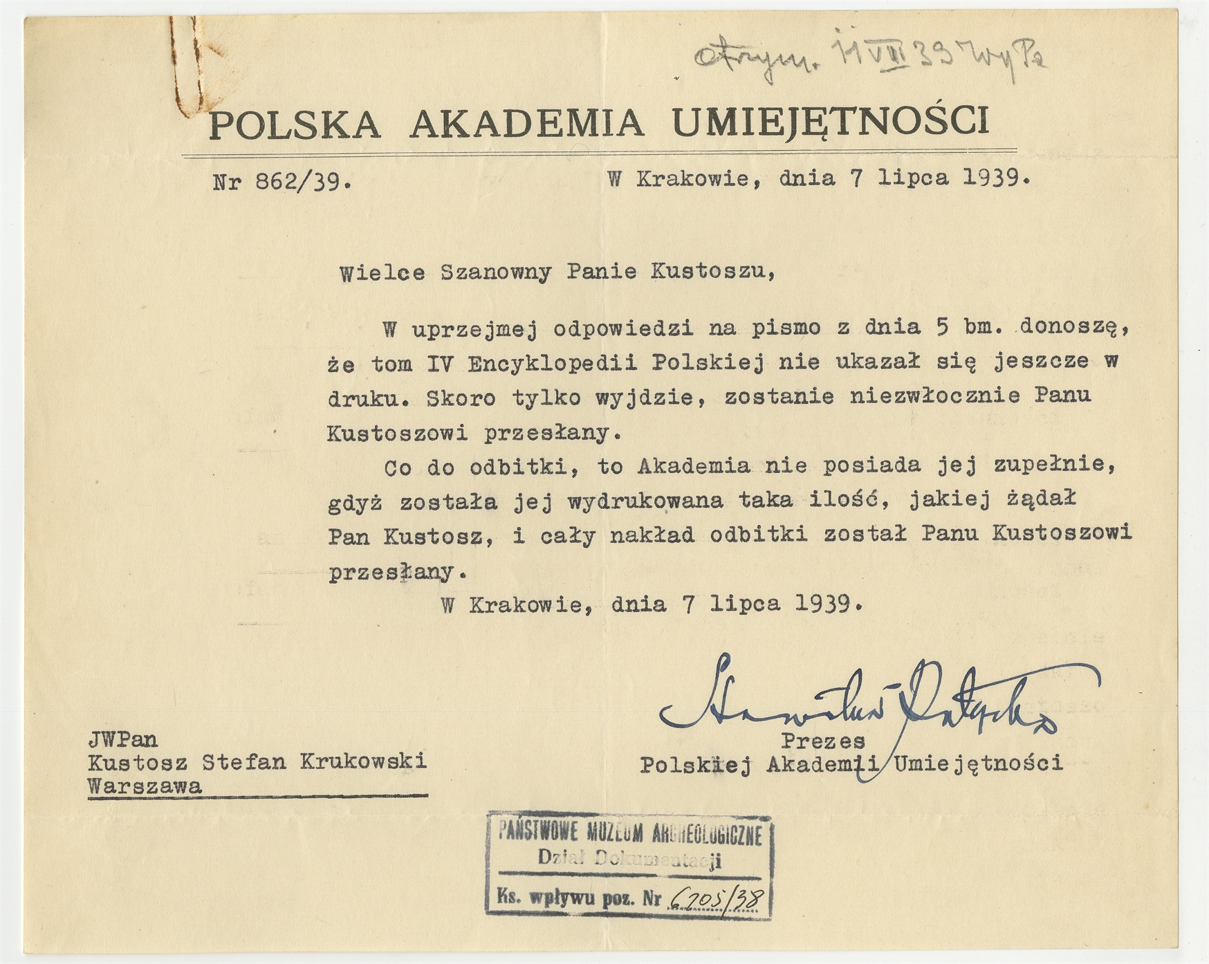 Maszynopis - list Prezesa PAU do Stefana Krukowskiego z dnia 7 lipca 1939 roku