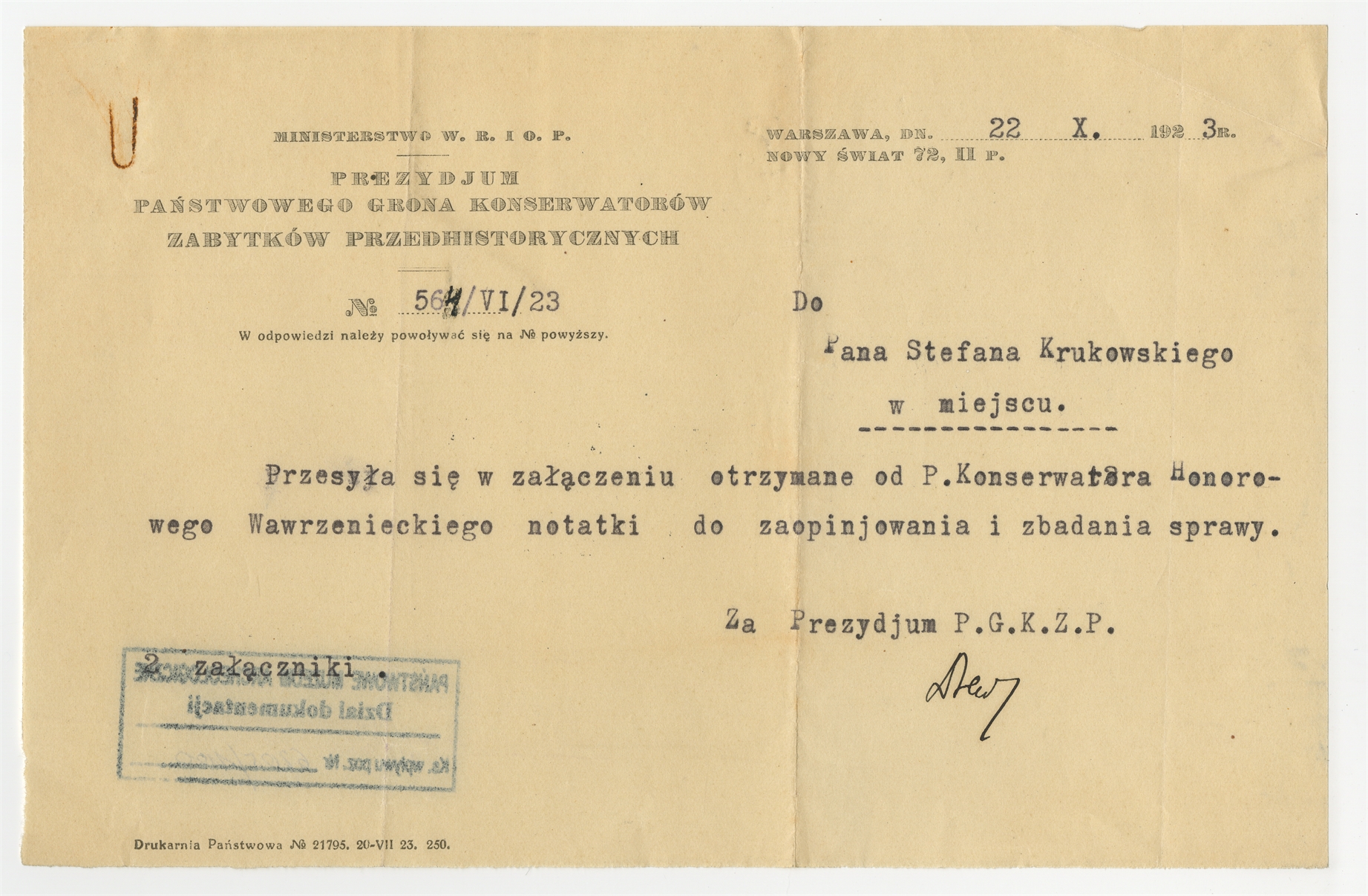 Maszynopis - list Prezydium PGKZP do Stefana Krukowskiego z dnia 22 X 1923 roku
