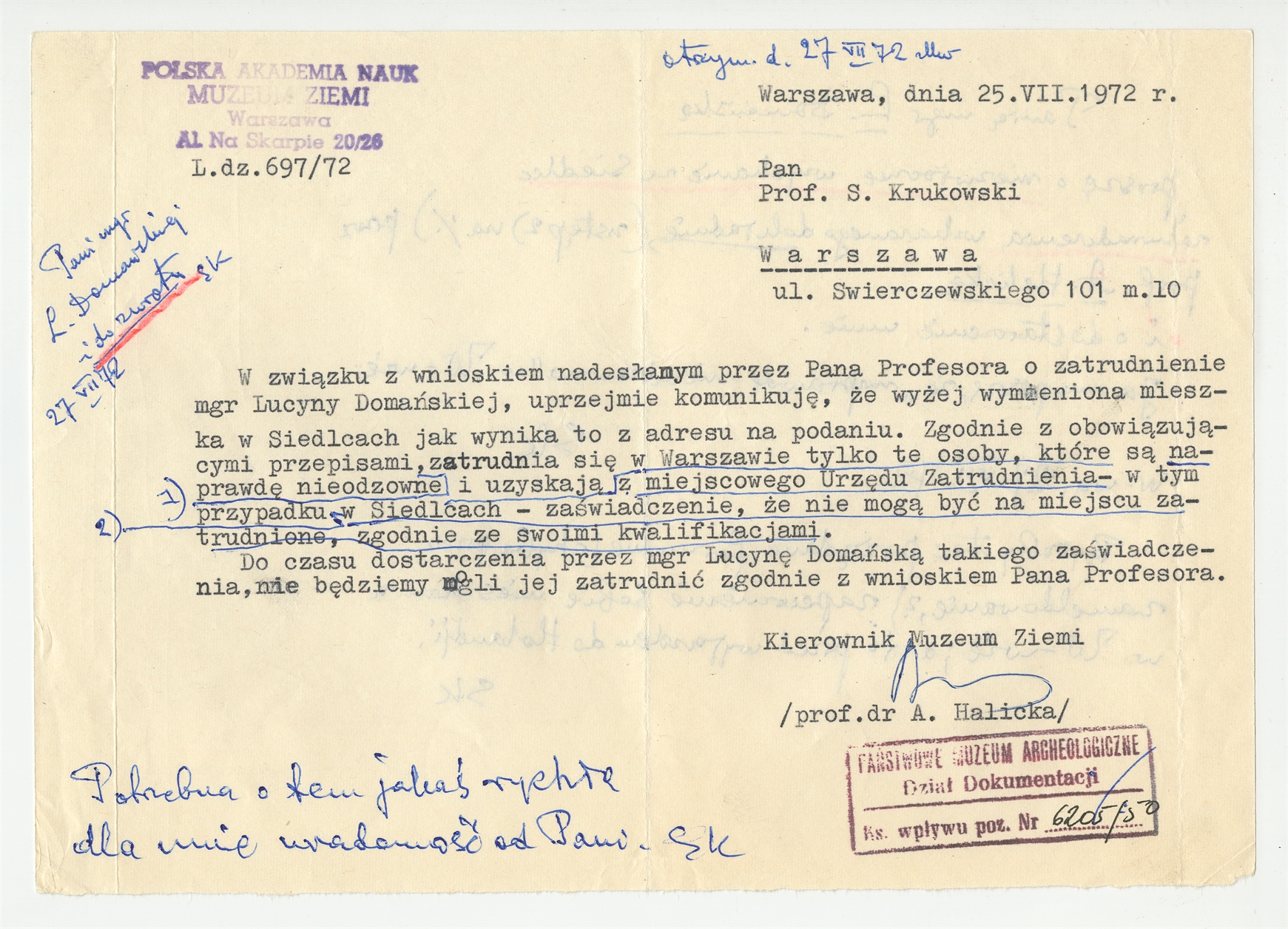 Maszynopis list prof. dr A. Halickiej do Stefana Krukowskiego z dn. 25 VII 1972 r.