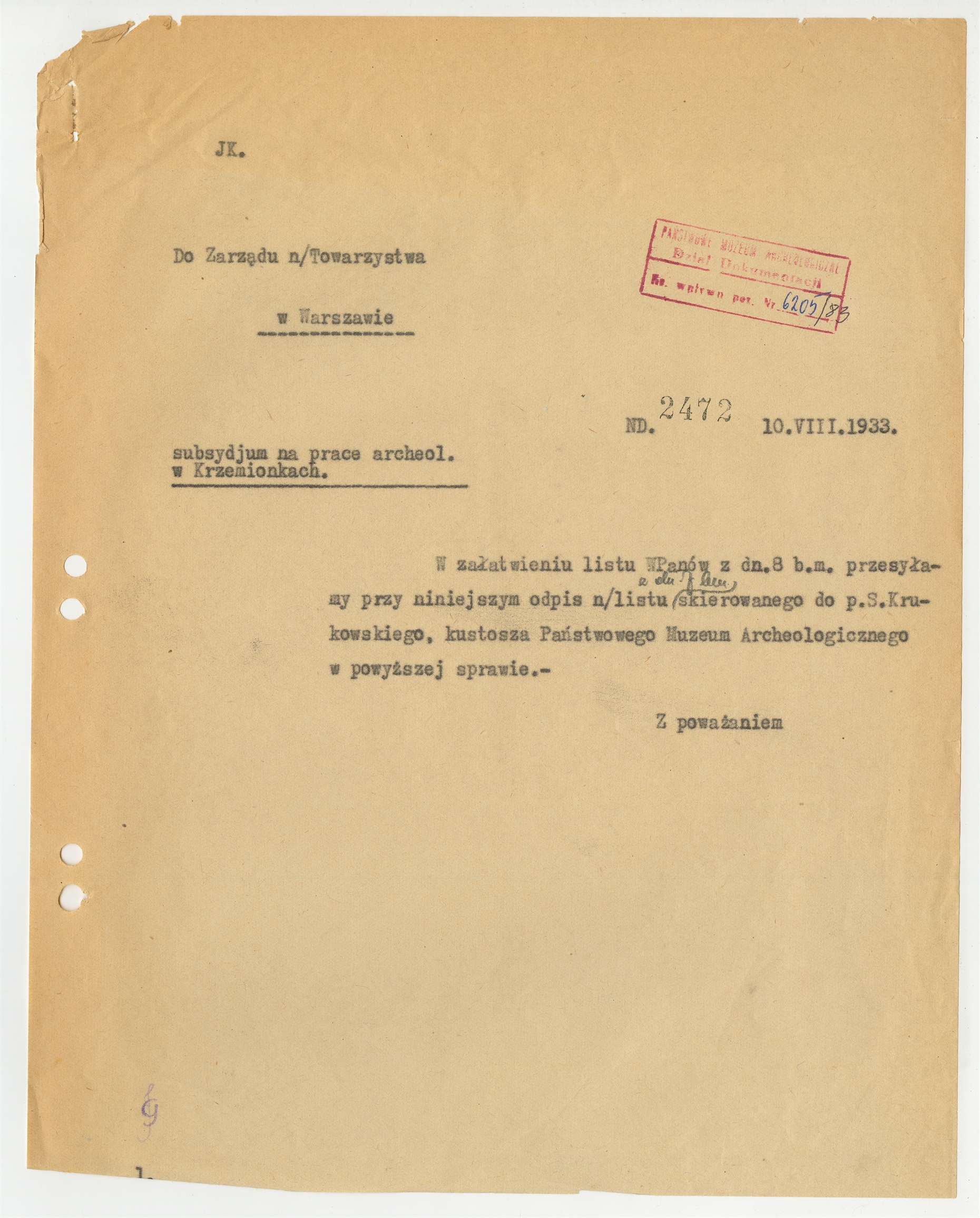 Maszynopis - list przewodni "Do Zarządu Towarzystwa w Warszawie z dnia 10 VIII 1933 roku dotyczący subsydjum na prace archeologiczne w Krzemionkach