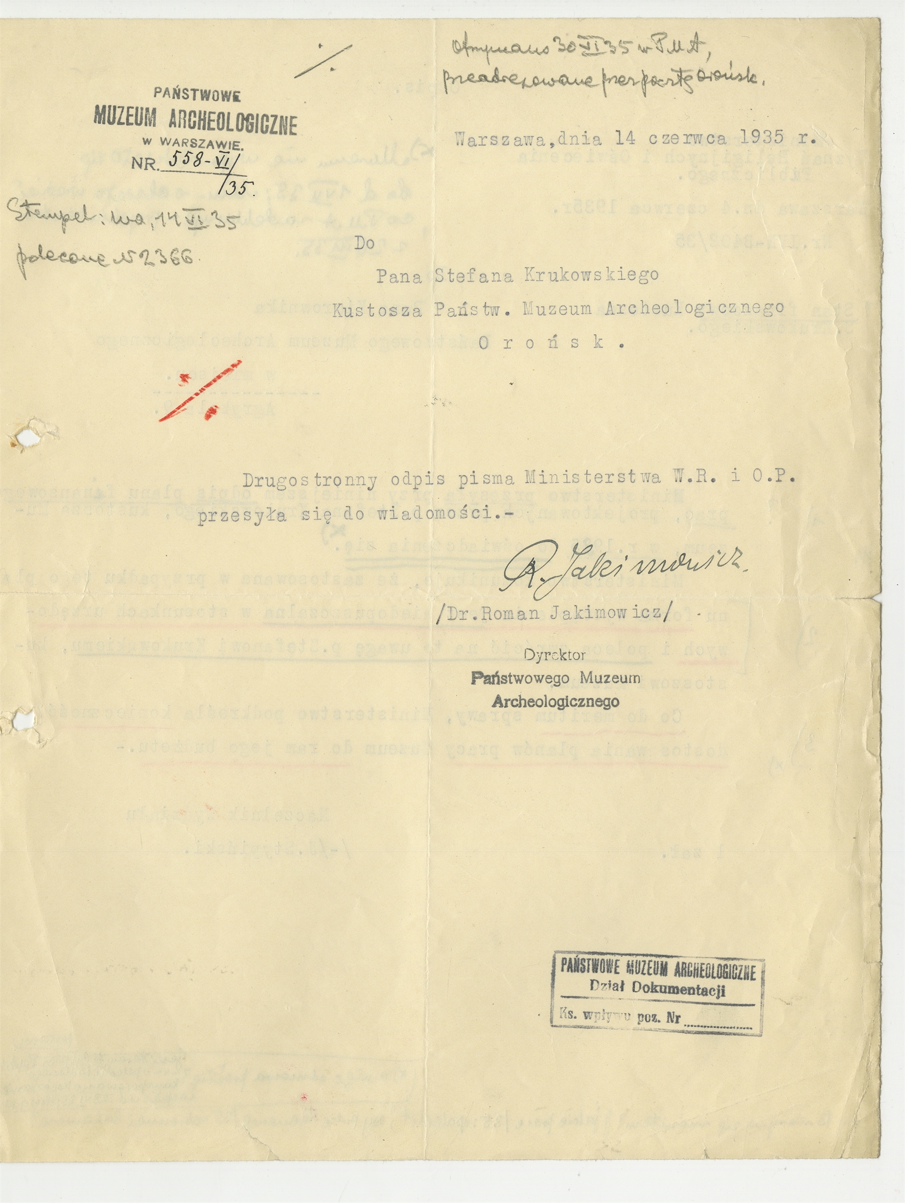 Maszynopis - list Romana Jakimowicza do Stefana Krukowskiego z dnia 14 czerwca 1935 roku