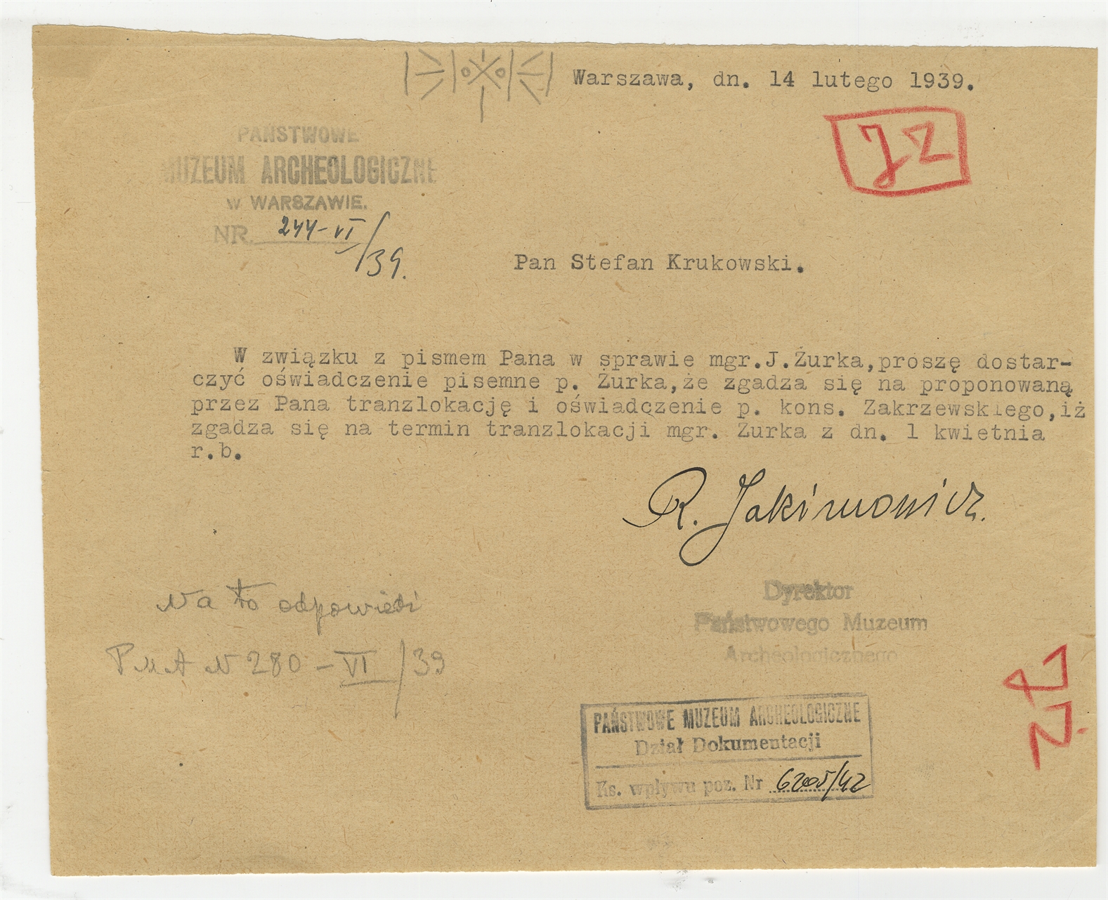 Maszynopis - list Romana Jakimowicza do Stefana Krukowskiego z dnia 14 lutego 1939 roku w sprawie Jana Żurka