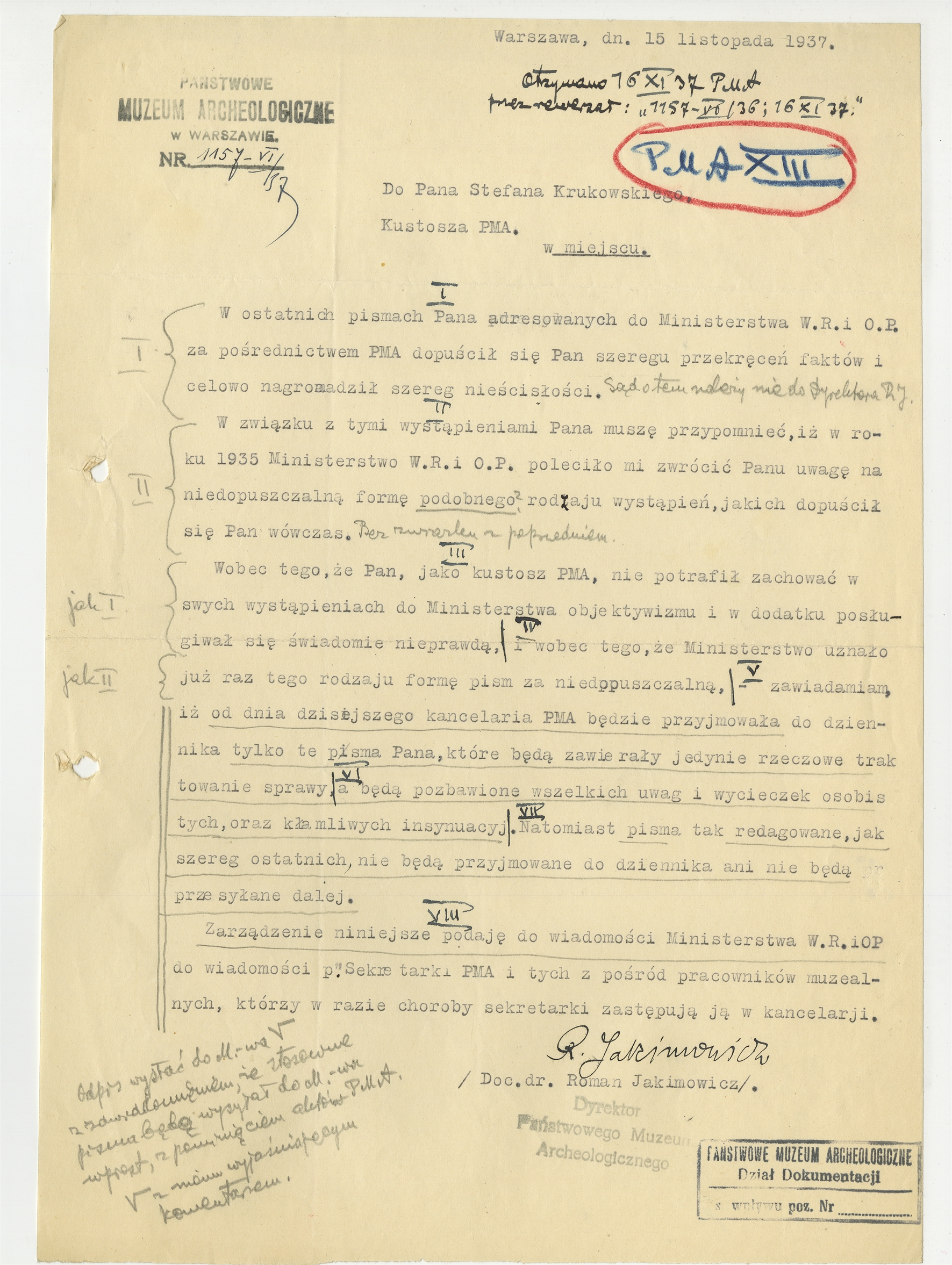 Maszynopis - list Romana Jakimowicza do Stefana Krukowskiego z dnia 15 listopada 1937 roku w sprawie korespondencji do Ministerstwa W.R. i O.P.