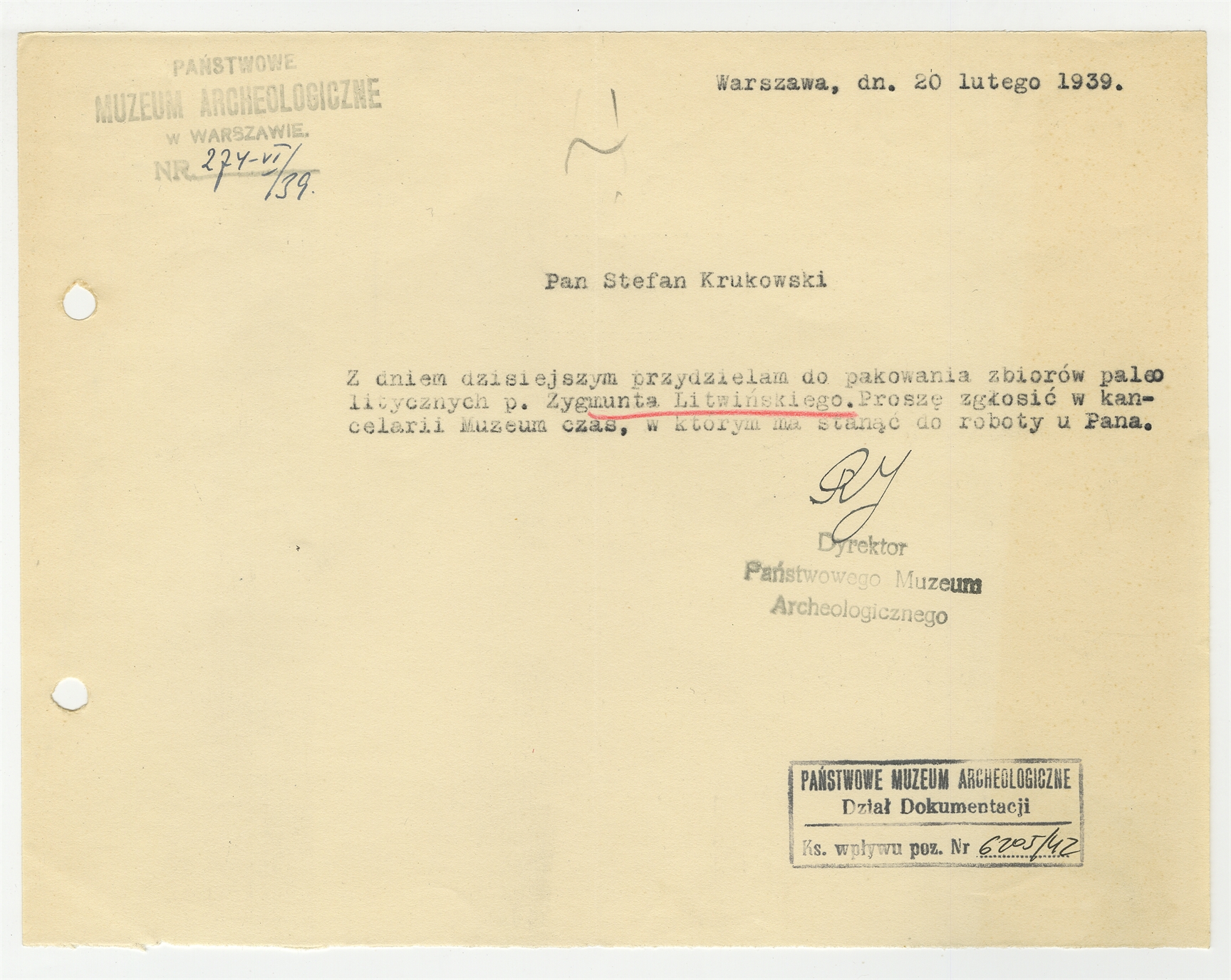 Element 1 - Maszynopis - list Romana Jakimowicza do Stefana Krukowskiego z dnia 20 lutego 1939 roku w sprawie pracownika do pakowania zbiorów