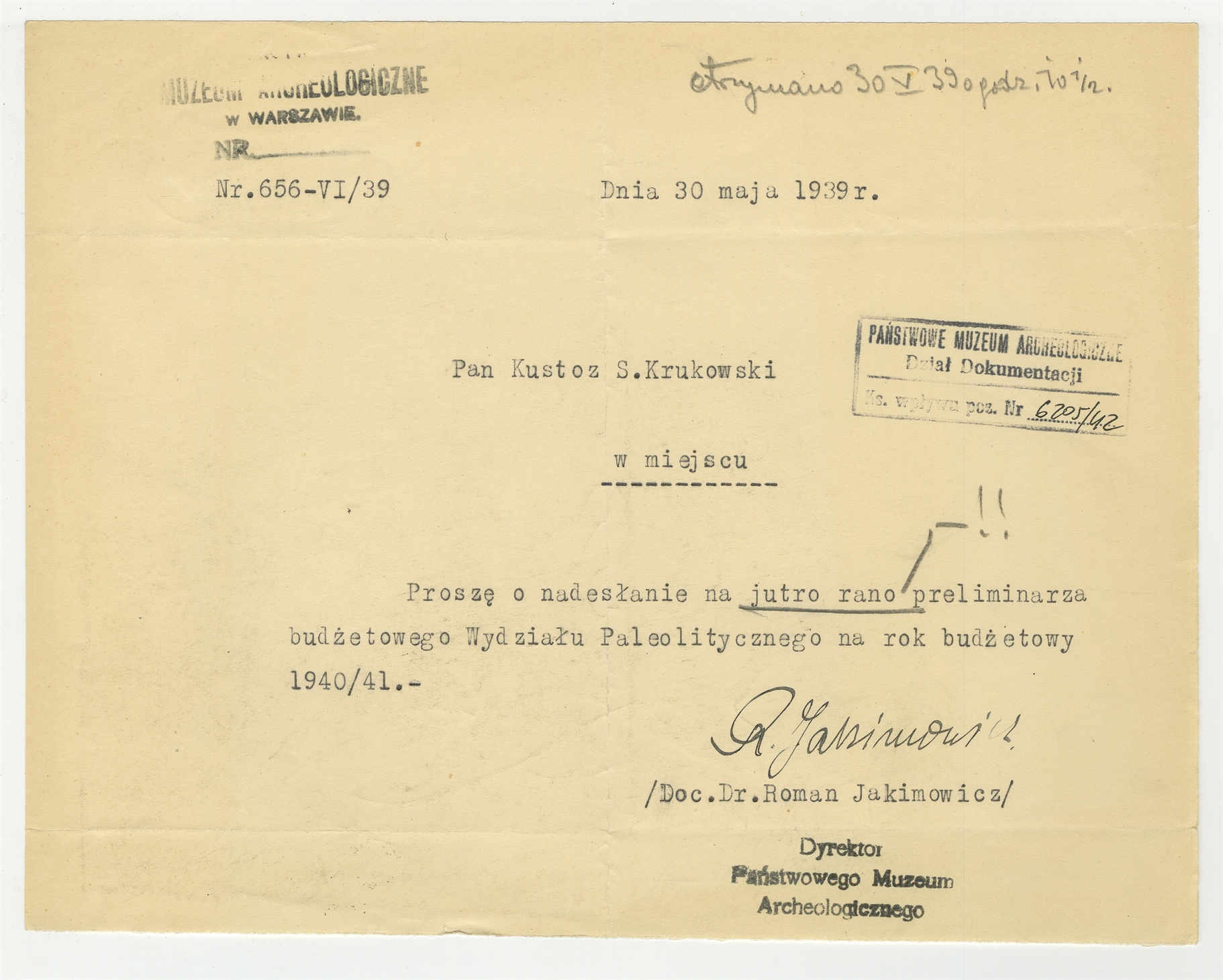 Maszynopis - list Romana Jakimowicza do Stefana Krukowskiego z dnia 30 maja 1939 roku w sprawie preliminarza budżetowego