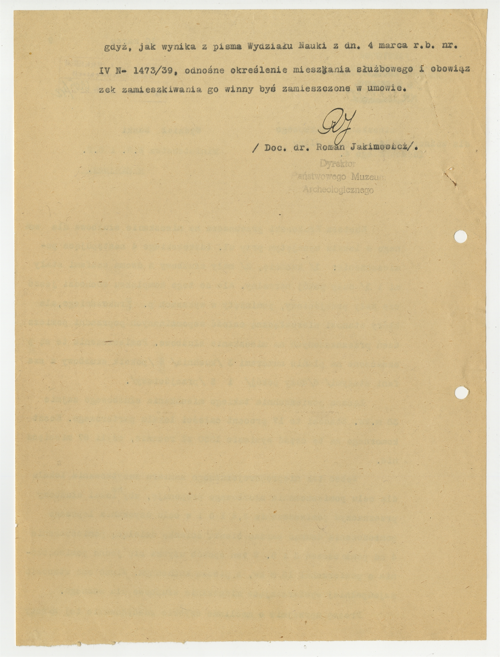 Maszynopis - list Romana Jakimowicza do Wydziału Nauki Ministerstwa W.R. i O.P. z dnia 10 marca 1939 roku w sprawie mieszkania służbowego dla woźnego (cd)