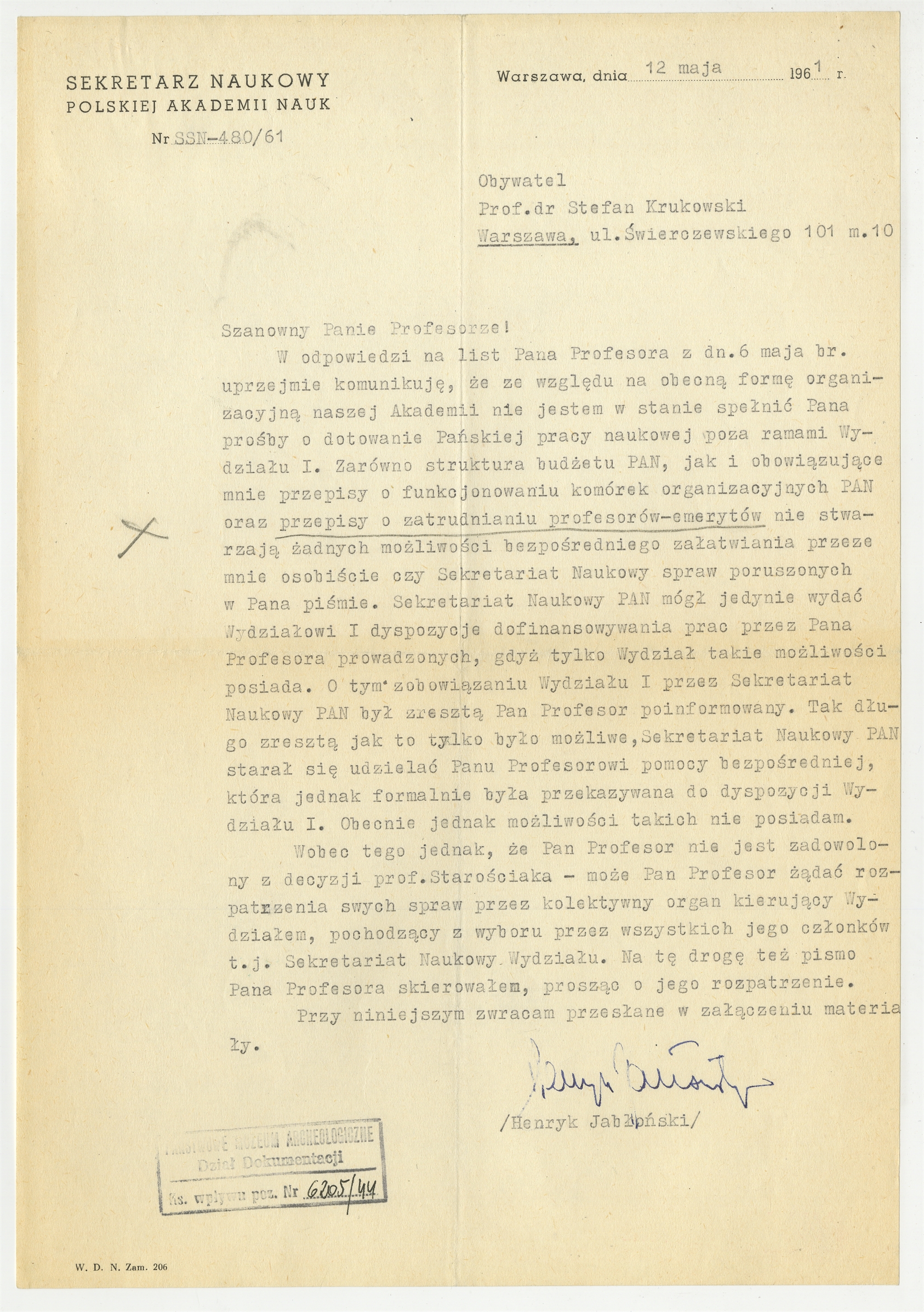 Maszynopis - list Sekretarza Naukowego PAN H. Jabłońskiego do S. Krukowskiego z dn. 12 V 1961 r.