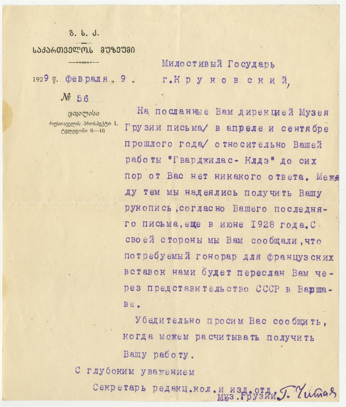 Maszynopis - list sekretarza redakcji wydawnictwa w Muzeum Gruzji do Stefana Krukowskiego z dnia 9 lutego 1929 roku
