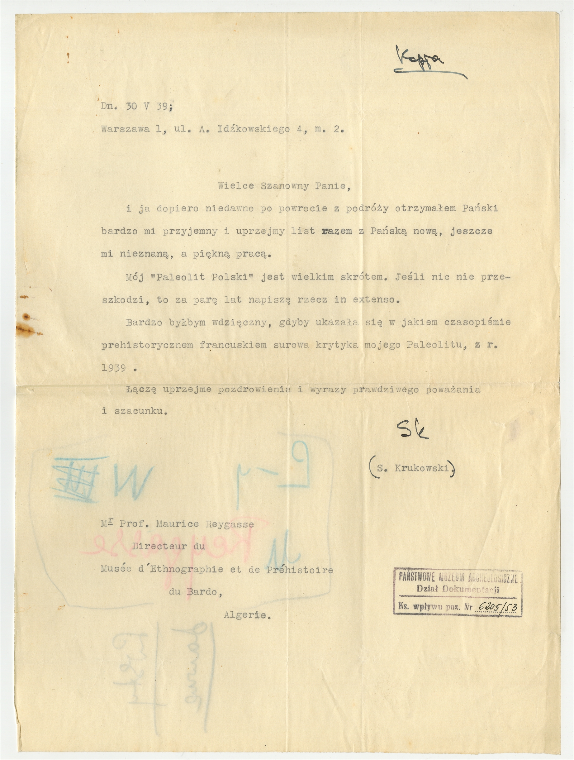 Maszynopis - list Stefana Krukowskiego do Maurice Reygasse z dnia 30 V [19]39 roku