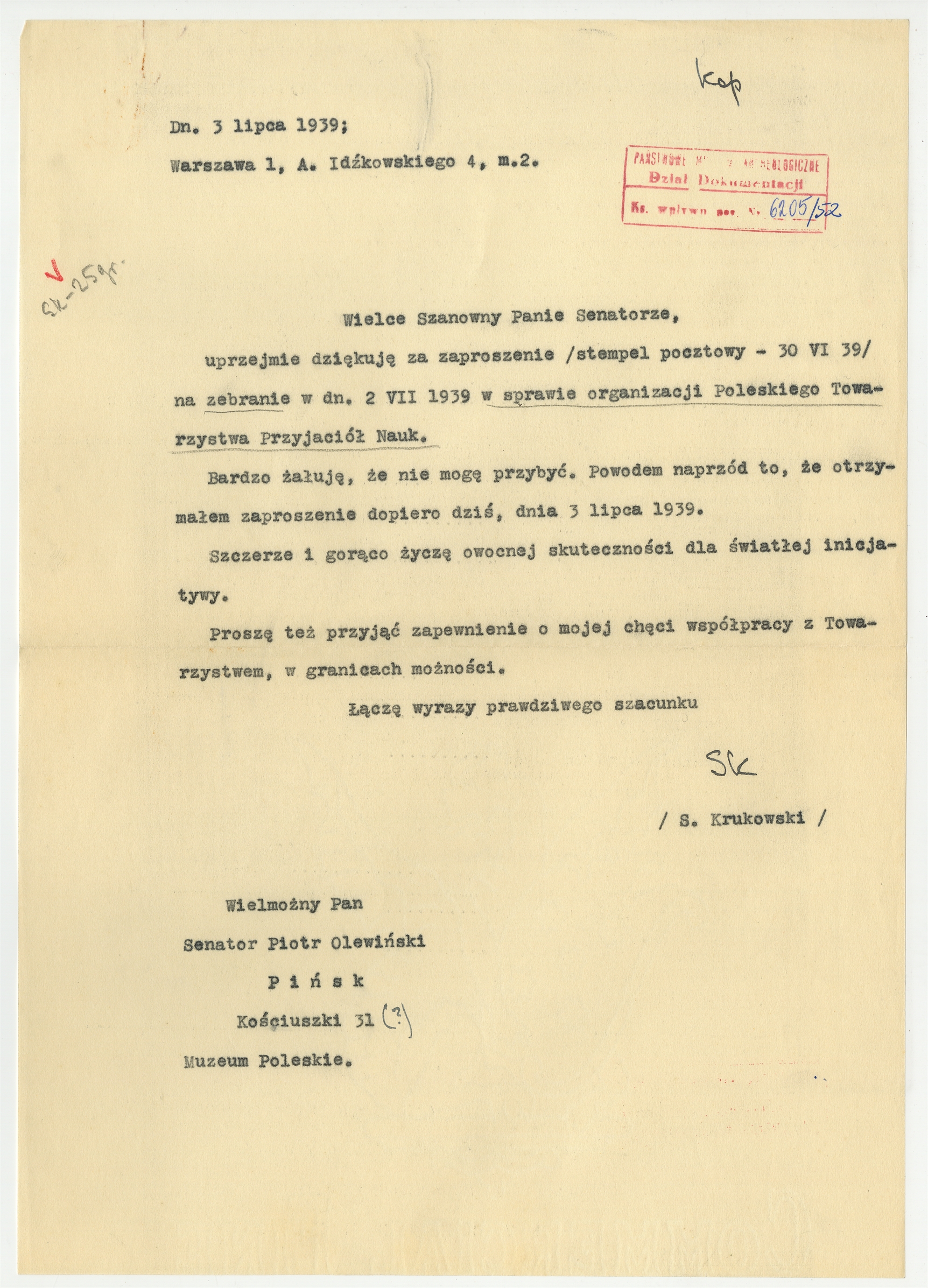 Maszynopis - list Stefana Krukowskiego do Piotra Olewińskiego z dnia 3 lipca 1939 roku