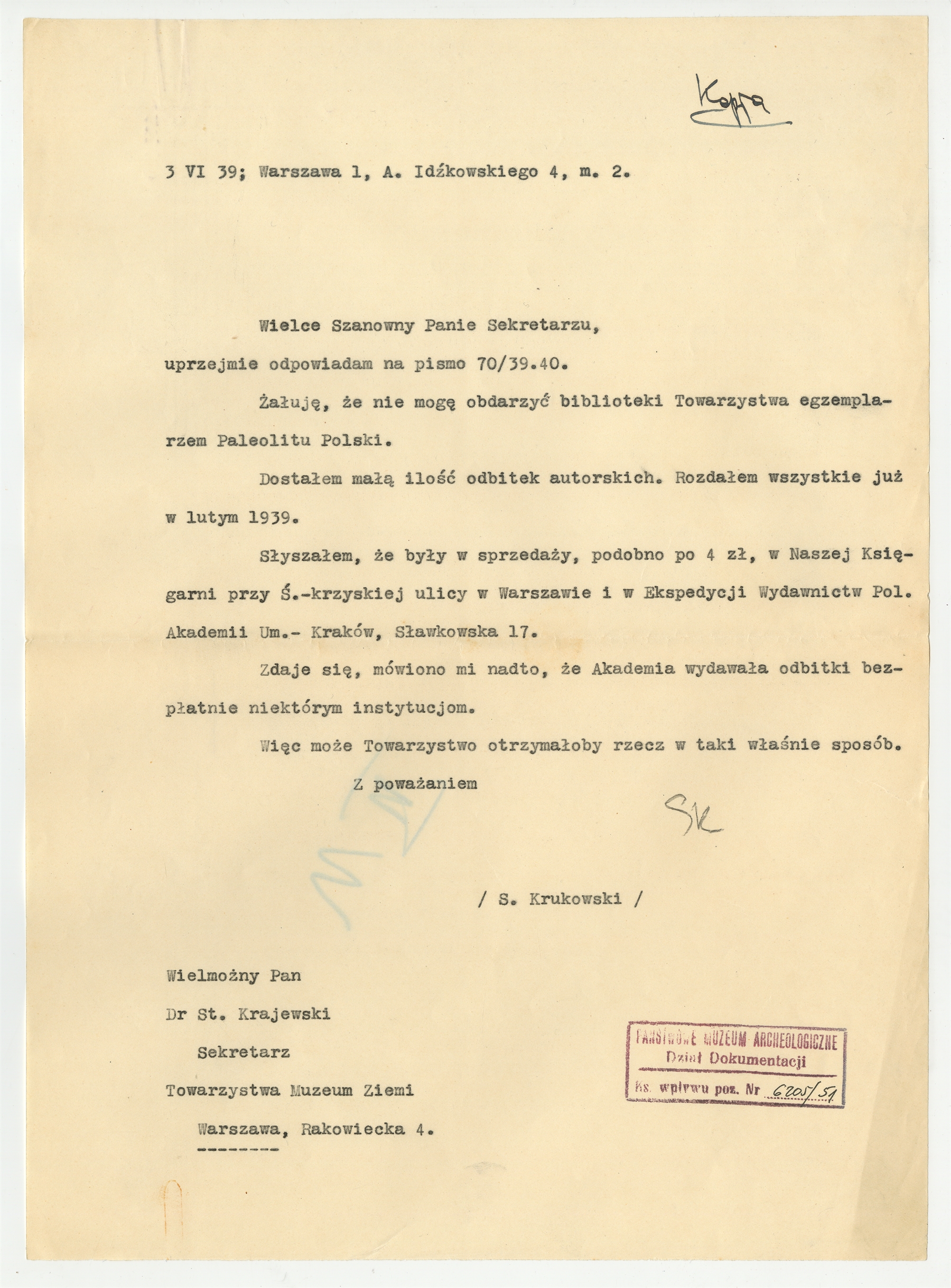 Maszynopis - list Stefana Krukowskiego do St. Krajewskiego z dnia 3 VI [19]39 roku