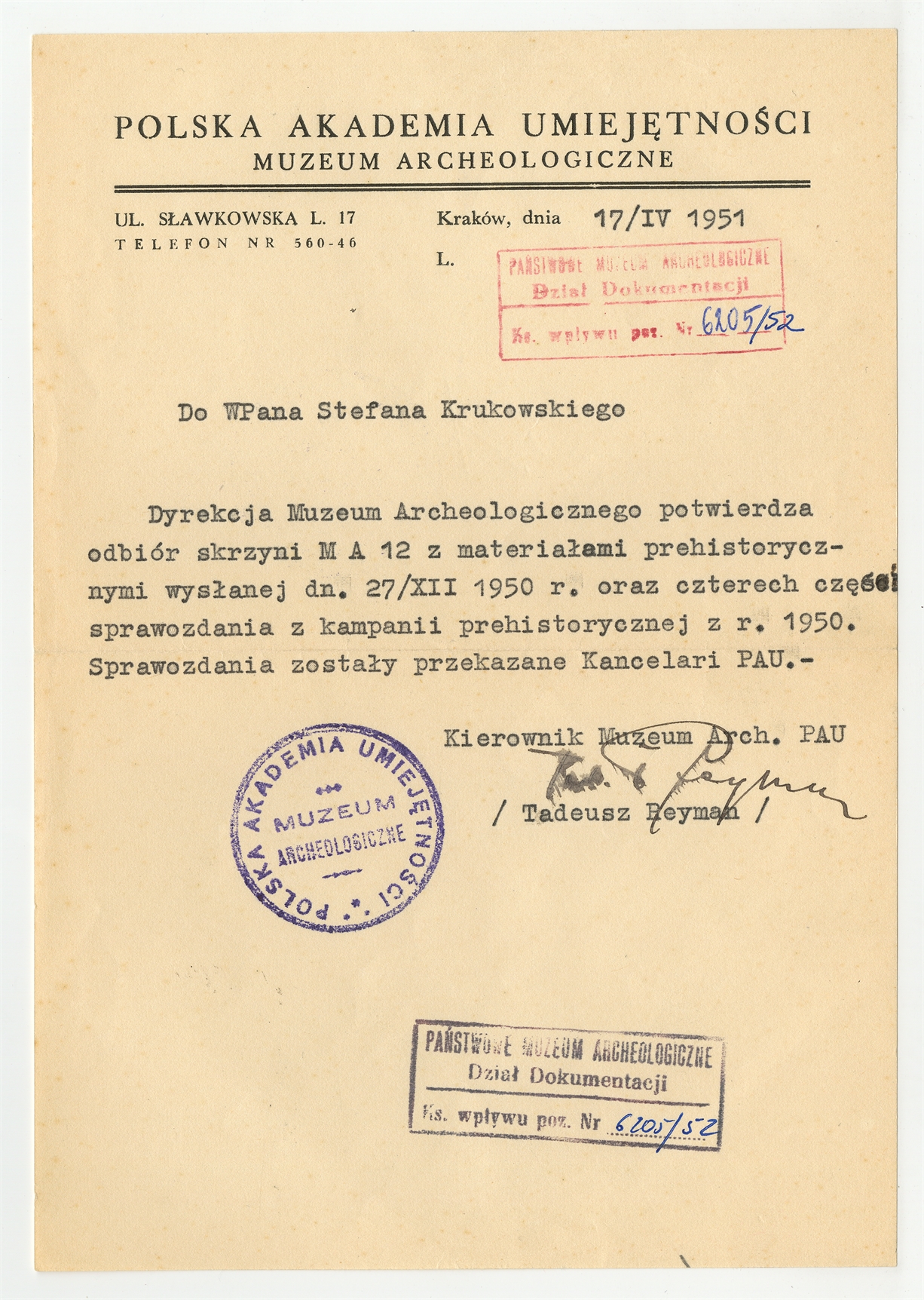 Maszynopis - list Tadeusza Reymana kierownika Muzeum Archeologicznego PAU do Stefana Krukowskiego z dnia 17 IV 1951 roku