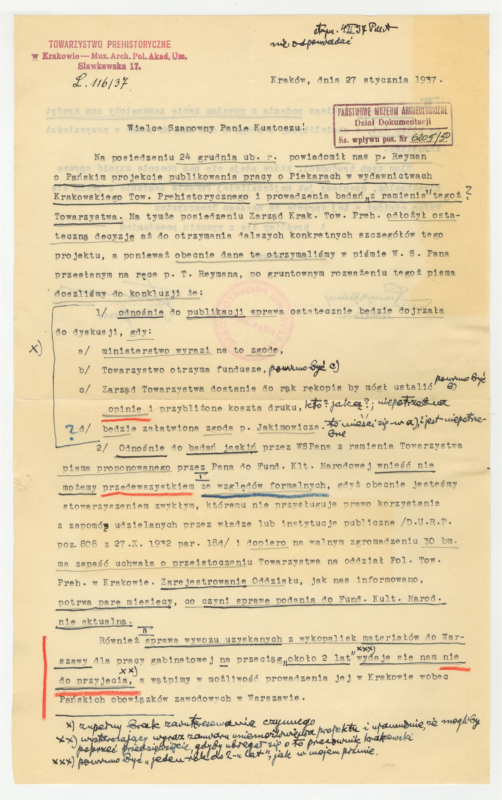 Maszynopis - list Towarzystwa Prehistorycznego w Krakowie do Stefana Krukowskiego z dn. 27 I 1937 r.