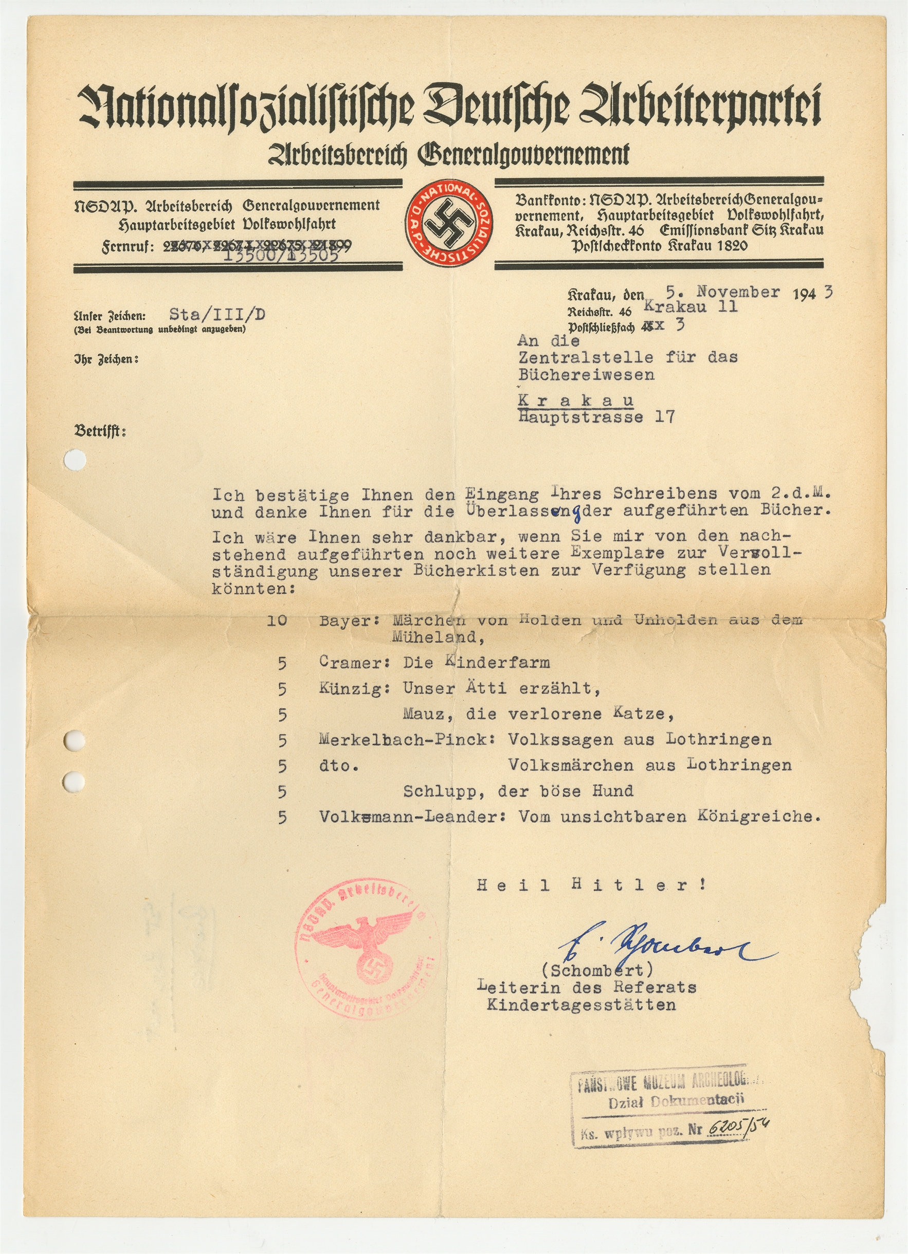 Maszynopis - list w języku niemieckim pani Schombert do Zentralstelle fur das Buchereinwesen z dnia 5 listopada 1943 roku