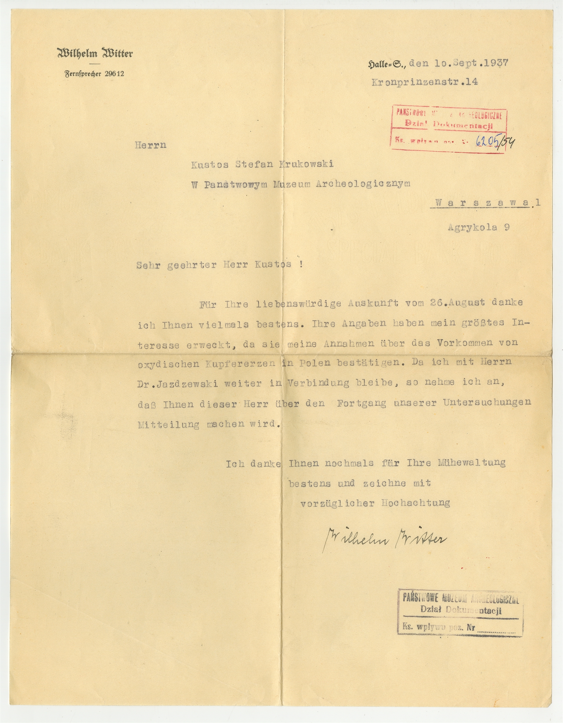 Maszynopis - list w języku niemieckim Wilhelma Wittera do Stefana Krukowskiego z dnia 10 września 1937 roku
