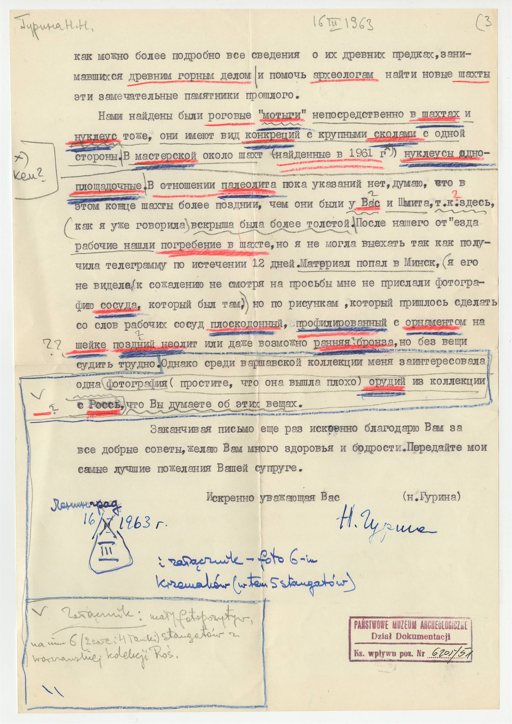 Maszynopis - list w języku rosyjskim Niny Guriny do Stefana Krukowskiego z dnia 16 III 1963 roku (cd)