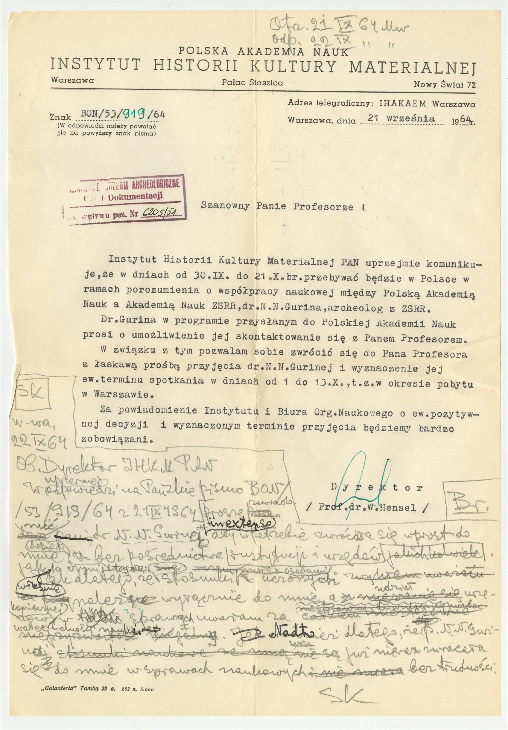Maszynopis - list Witolda Hensla do Stefana Krukowskiego z dnia 21 września 1964 roku. Na tej samej stronie rękopis - brudnopis odpowiedzi Stefana Krukowskiego z dnia 22 IX [19]64 roku na list