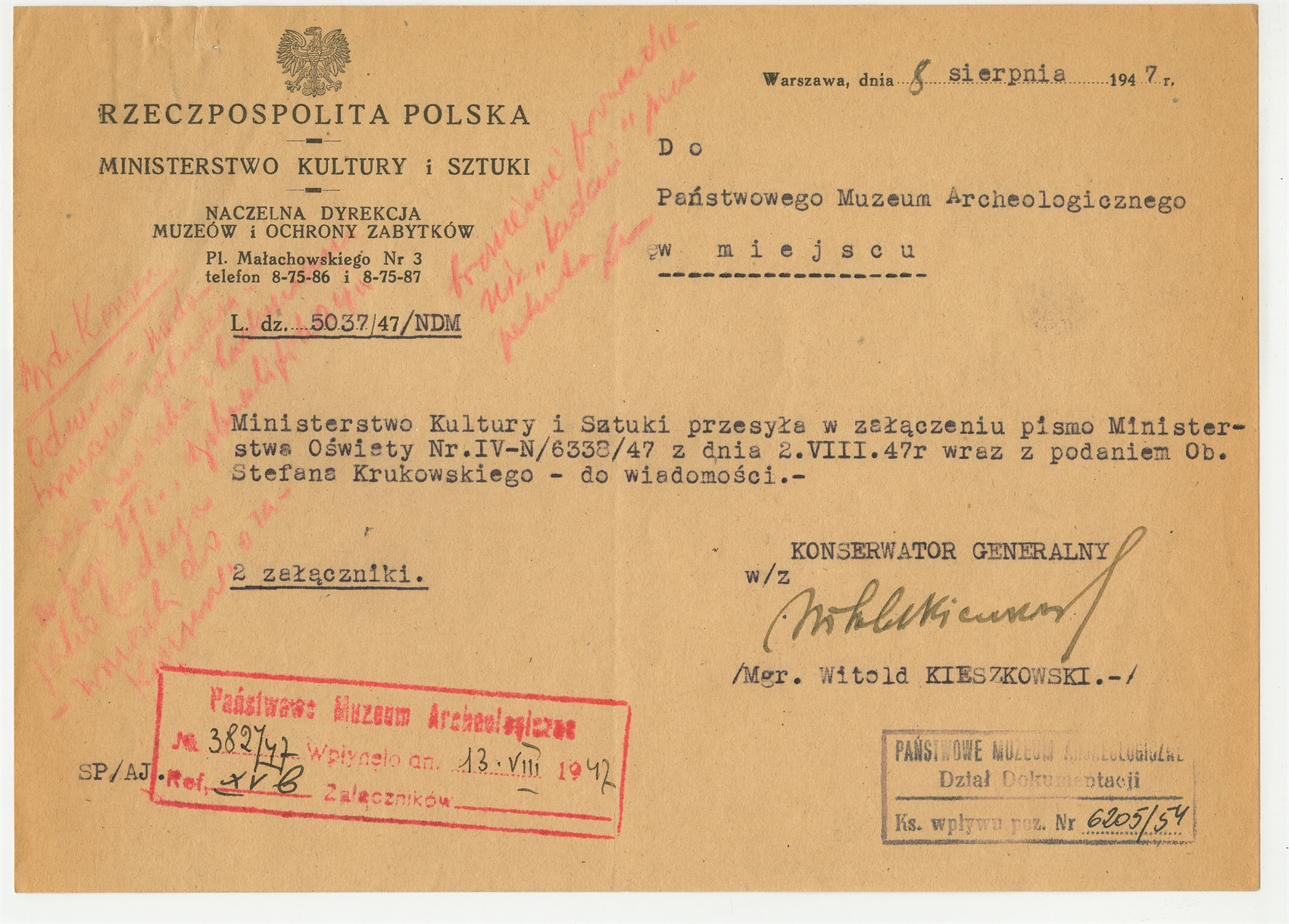 Maszynopis - list Witolda Kieszkowskiego z Ministerstwa Kultury i Nauki do PMA z dnia 8 sierpnia 1947 roku