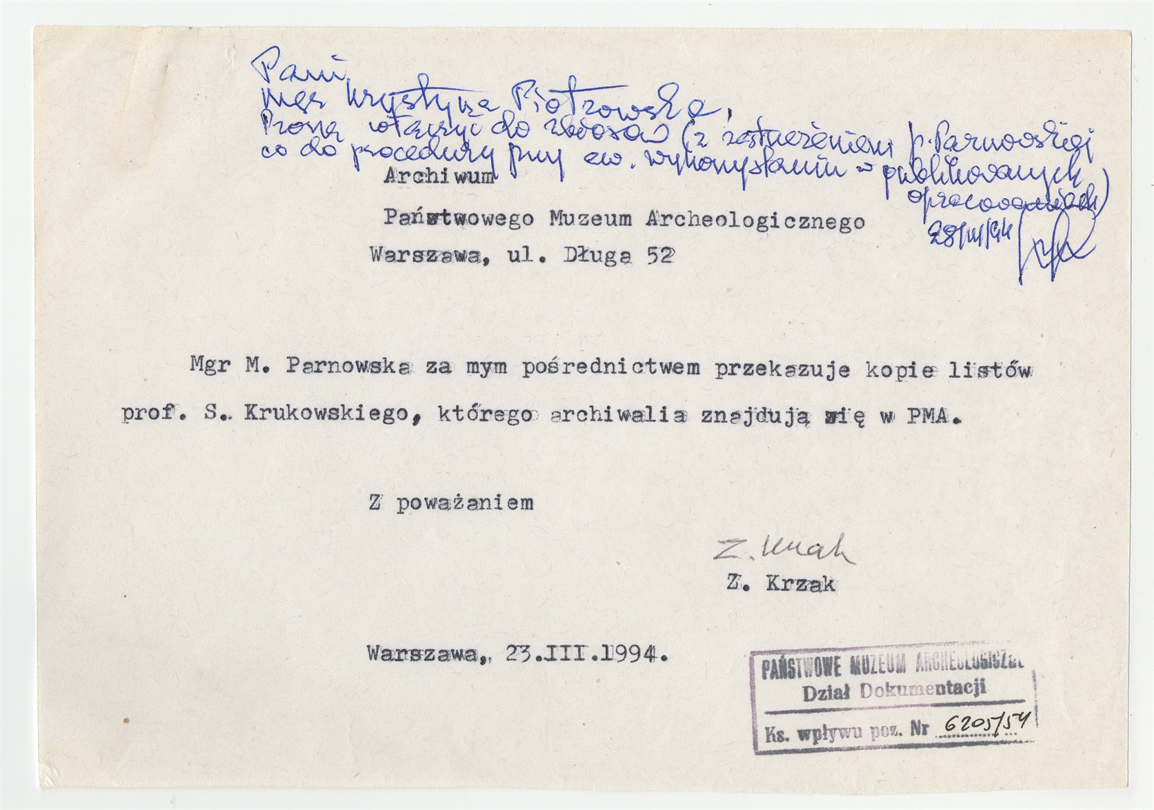 Maszynopis - list Z. Krzaka do Archiwum PMA w Warszawie z dnia 23 III 1994