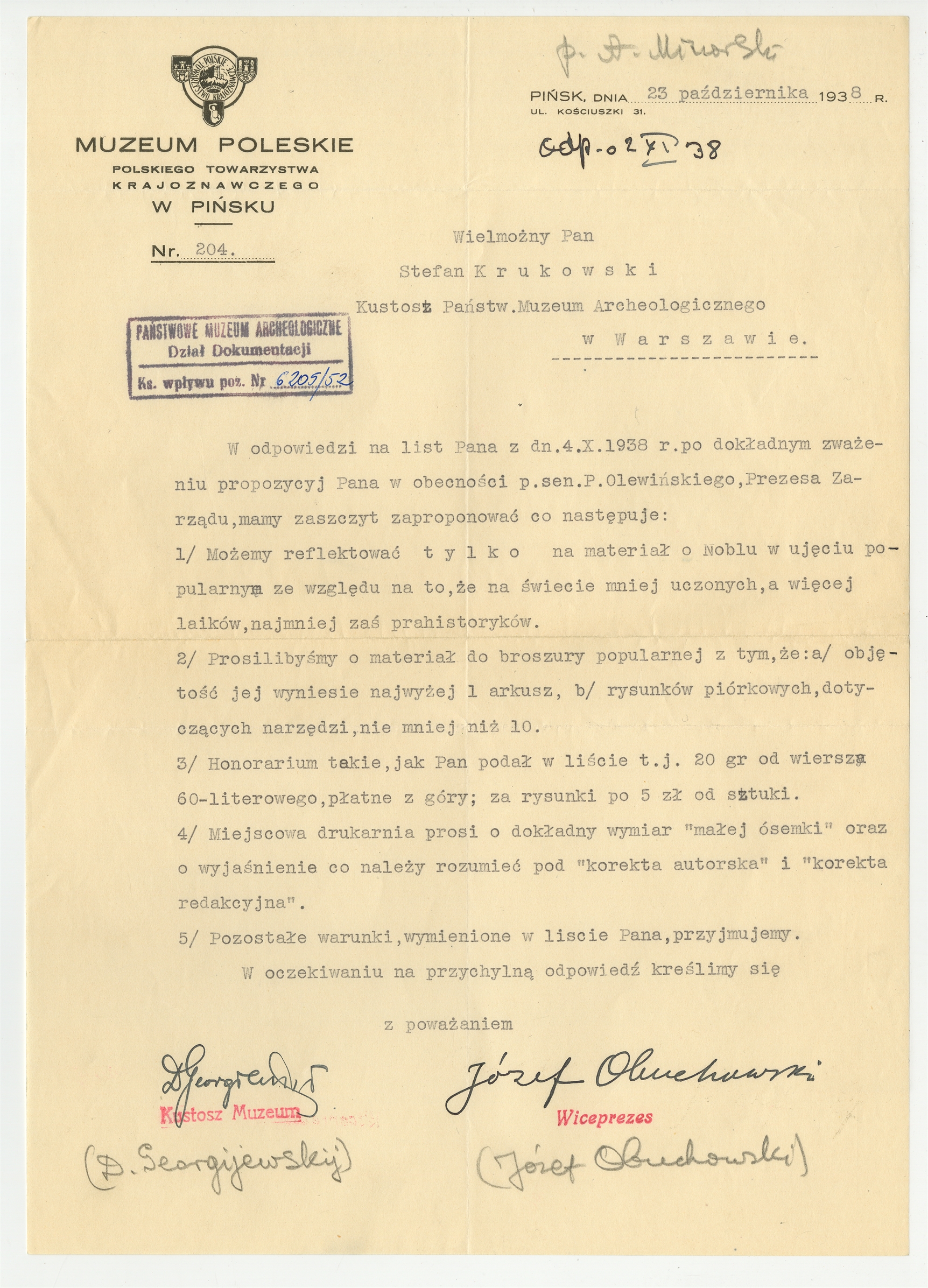Maszynopis - list z Muzeum Poleskiego w Pińsku do Stefana Krukowskiego z dnia 23 października 1938 roku
