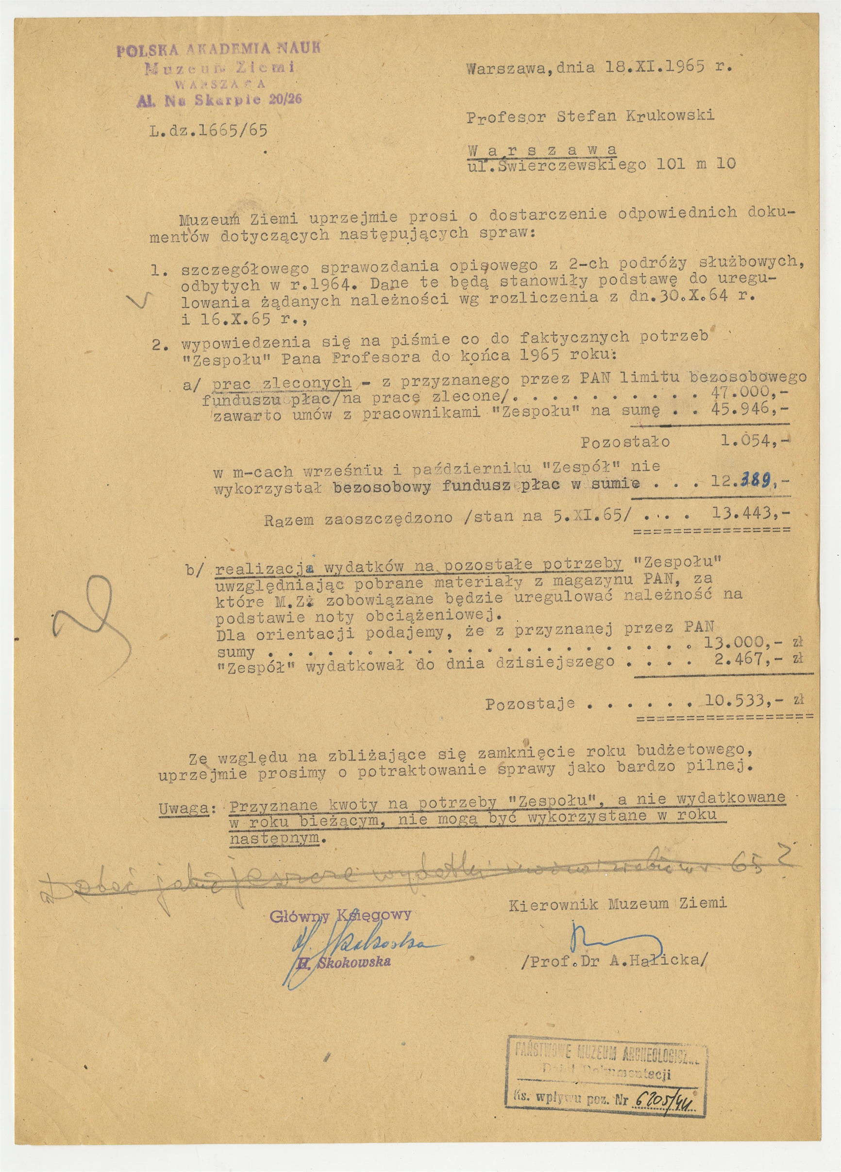 Maszynopis - list z Muzeum Ziemi PAN do S. Krukowskiego z dn. 18 XI 1965 r.