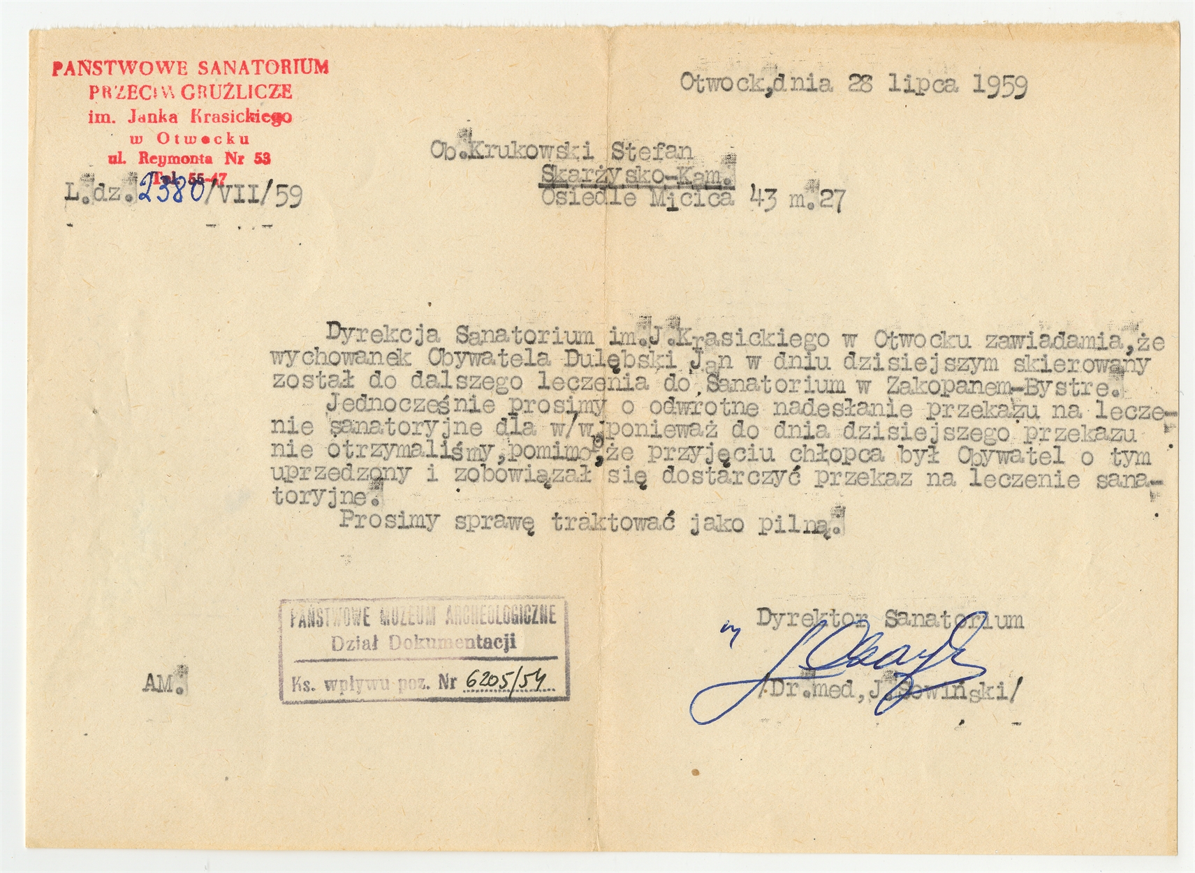 Maszynopis - list z Państwowego Sanatorium Przeciwgruźliczego w Otwocku do Stefana Krukowskiego z dnia 28 lipca 1959