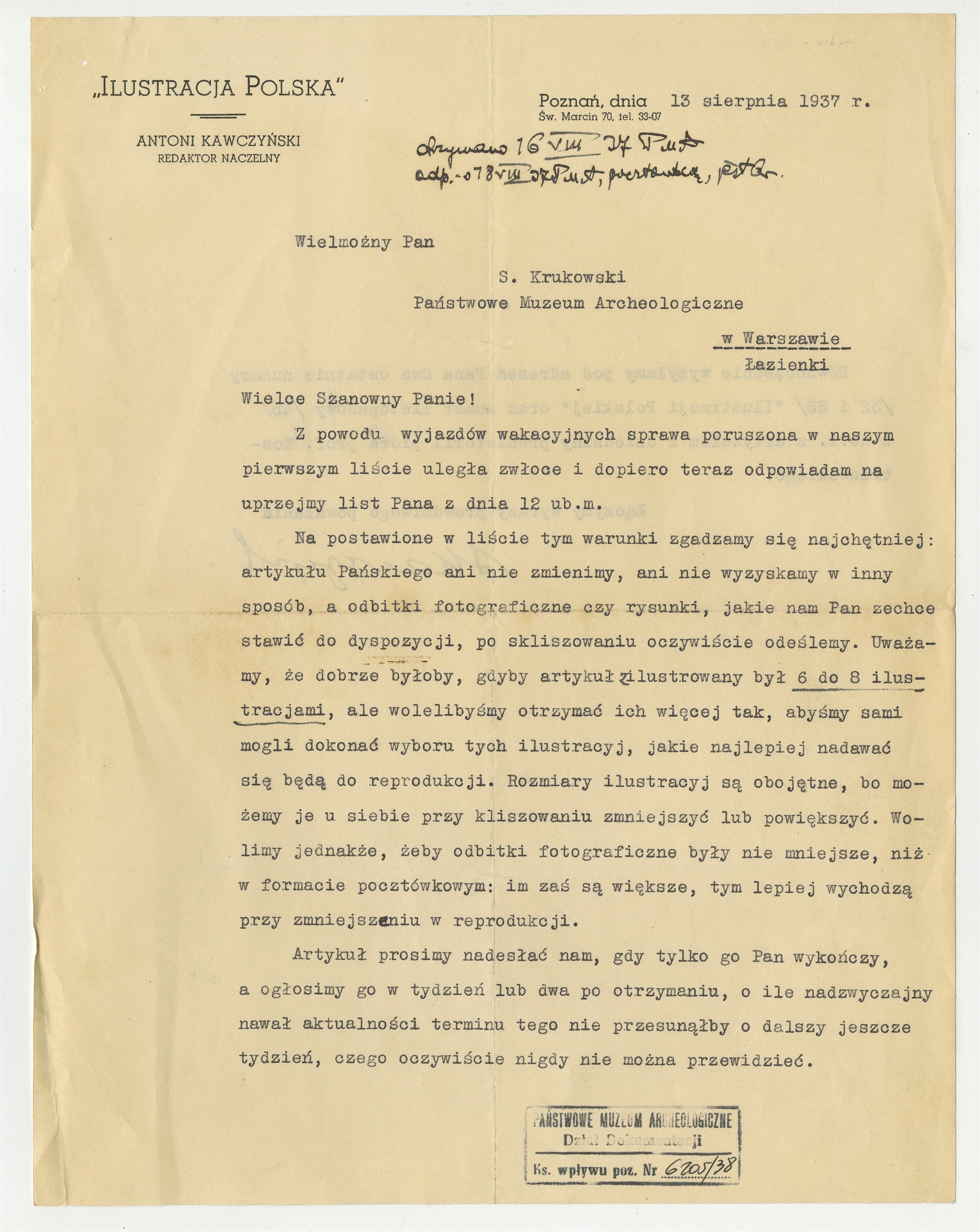 Maszynopis - list z redakcji czasopisma "Ilustracja Polska" do Stefana Krukowskiego z dnia 13 sierpnia 1937 roku