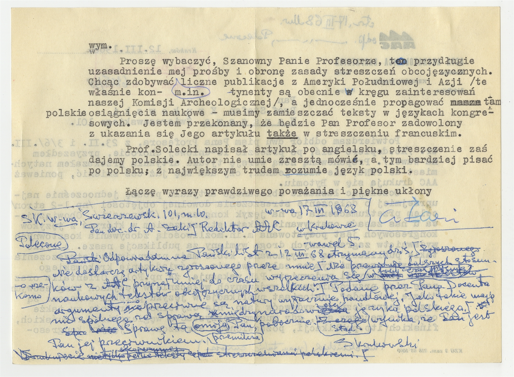 Maszynopis - list A. Żaki do Stefana Krukowskiego z dnia 12.III 1968 roku (cd). Rękopis - brudnopis odpowiedzi S. Krukowskiego z dnia 17 III 1968 na list.