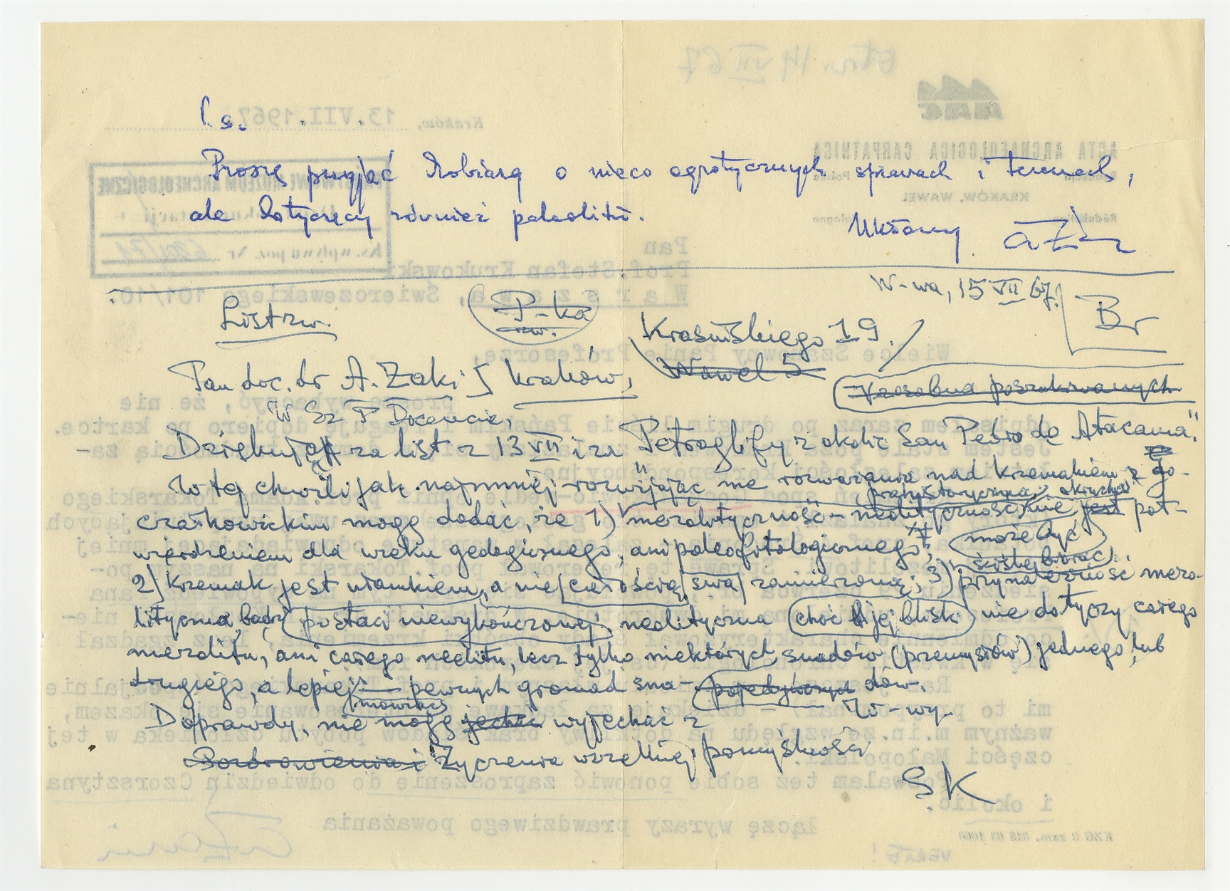 Maszynopis - list A. Żaki do Stefana Krukowskiego z dnia 13 VII 1967 roku. (cd) Rękopis - brudnopis odpowiedzi S. Krukowskiego na list.