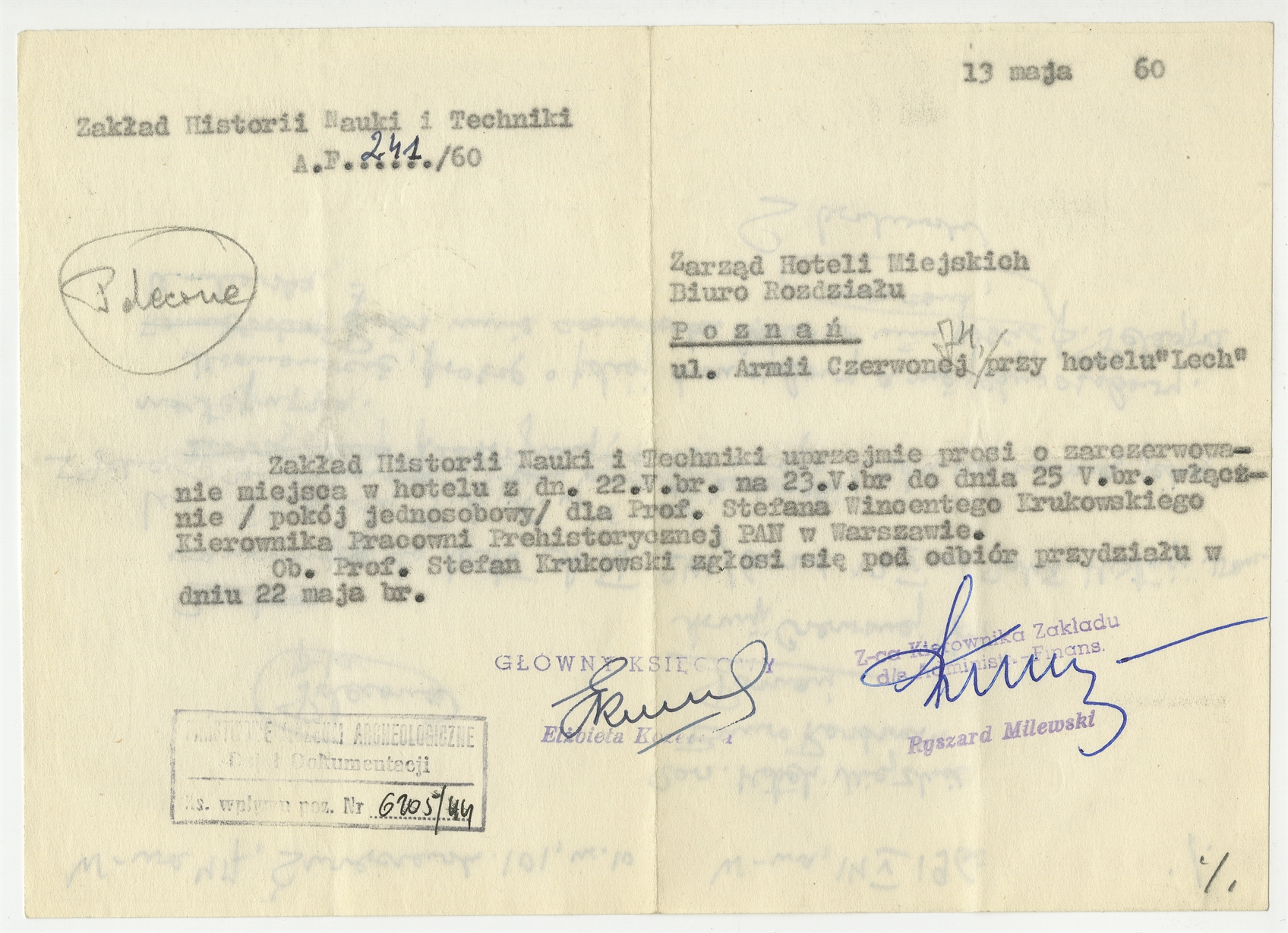 Maszynopis - list Zakładu Historii Nauki i Techniki do Zarządu Hoteli Miejskich w Poznaniu z dn. 13 V 1960 r.