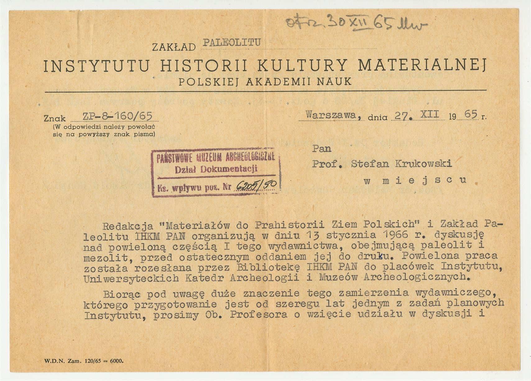 Maszynopis listu doc. dr Waldemara Chmielewskiego do prof. Stefana Krukowskiego z dn. 27 XII 1965 r.
