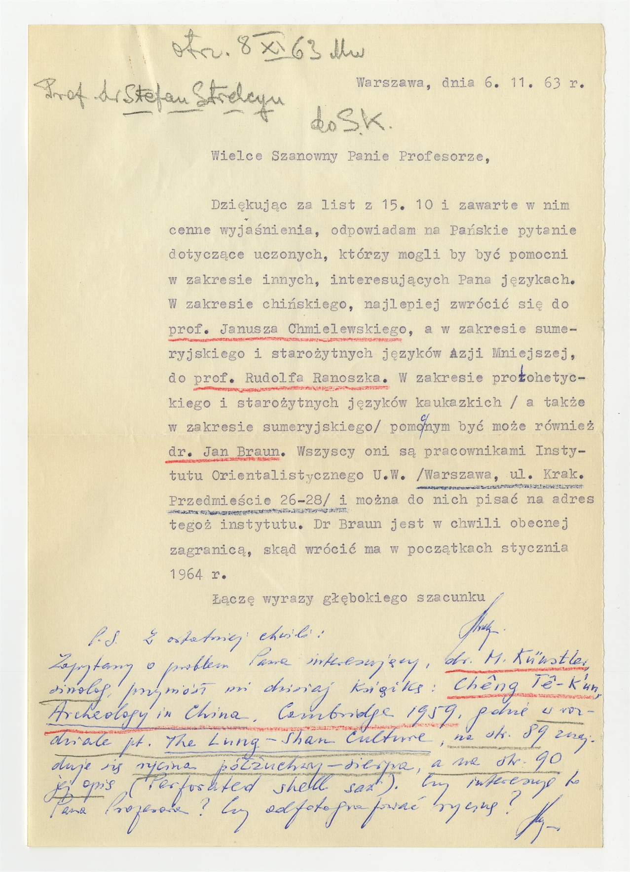Element 1 - Maszynopis listu dr Stefana Strelcyna z Instytutu Orientalistycznego UW do prof. S. Krukowskiego polecającego różnych specjalistów w dziedzinie języków z w/w Instytutu Warszawa 6.11.[19]63 - strona 1