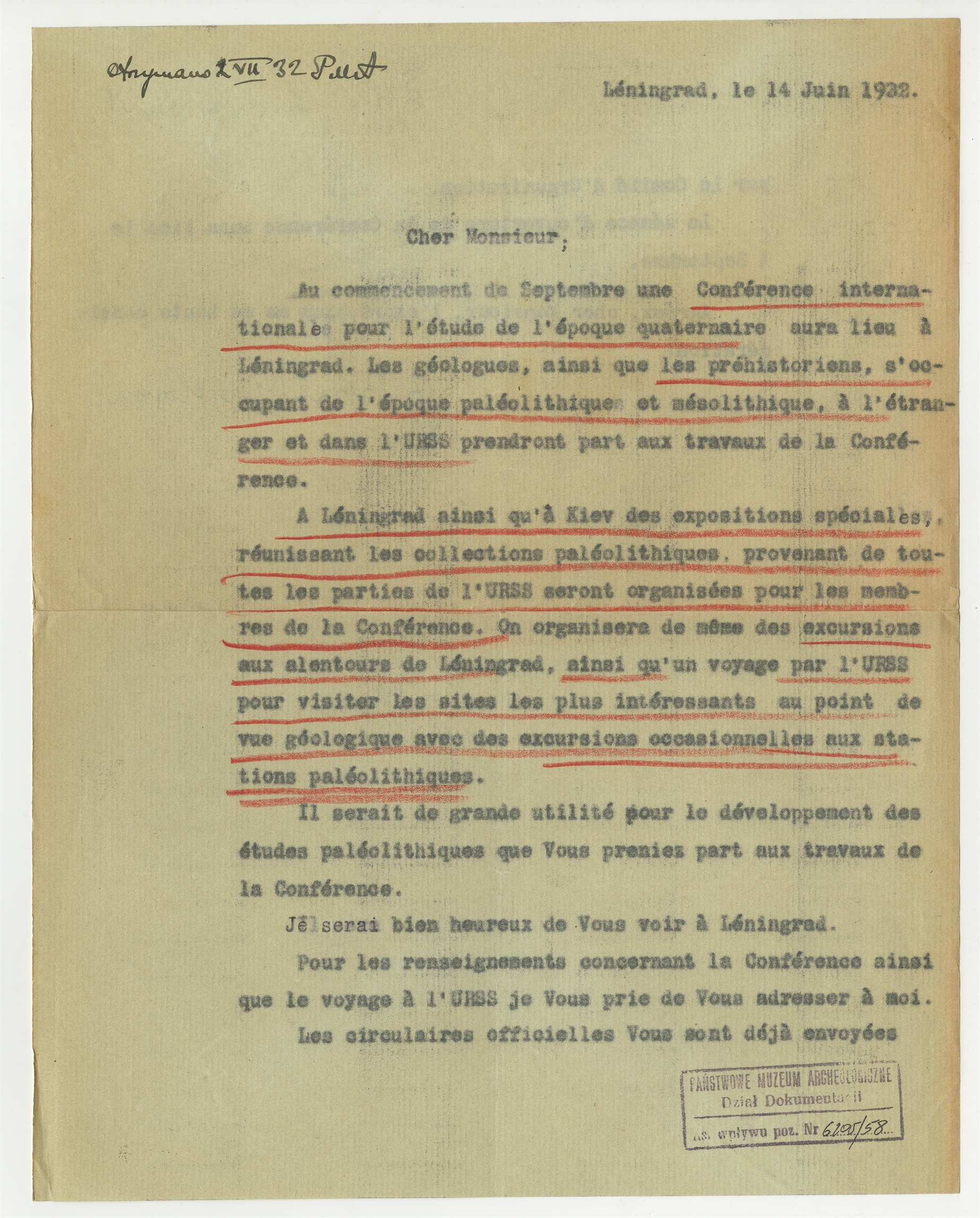 Maszynopis listu (j. francuski) do prof. Stefana Krukowskiego dotyczący Konferencji w Leningradzie Leningrad. 14 VI 1932