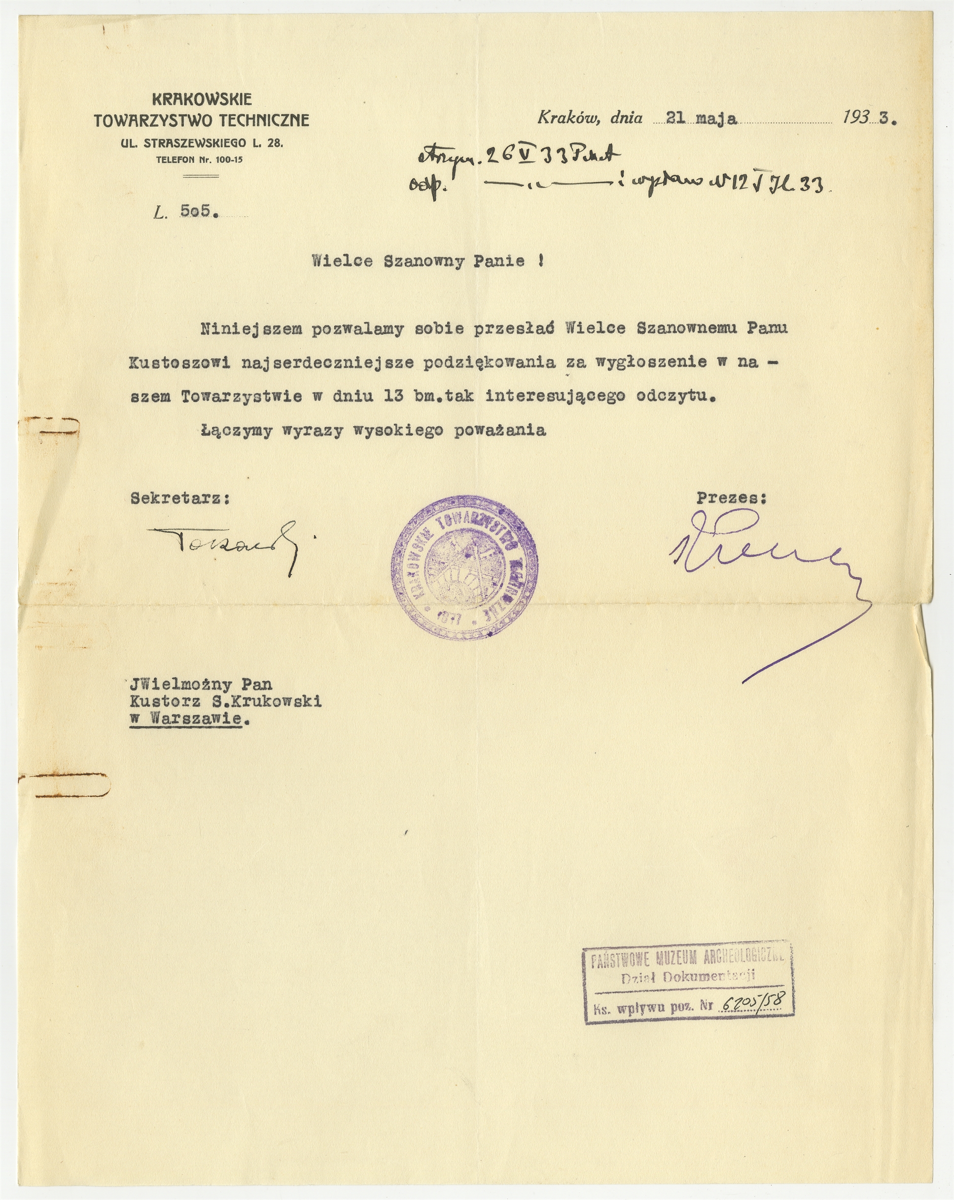 Maszynopis listu Krakowskiego Towarzystwa Technicznego do prof. Stefana Krukowskiego Kraków 21 V 1933 r.