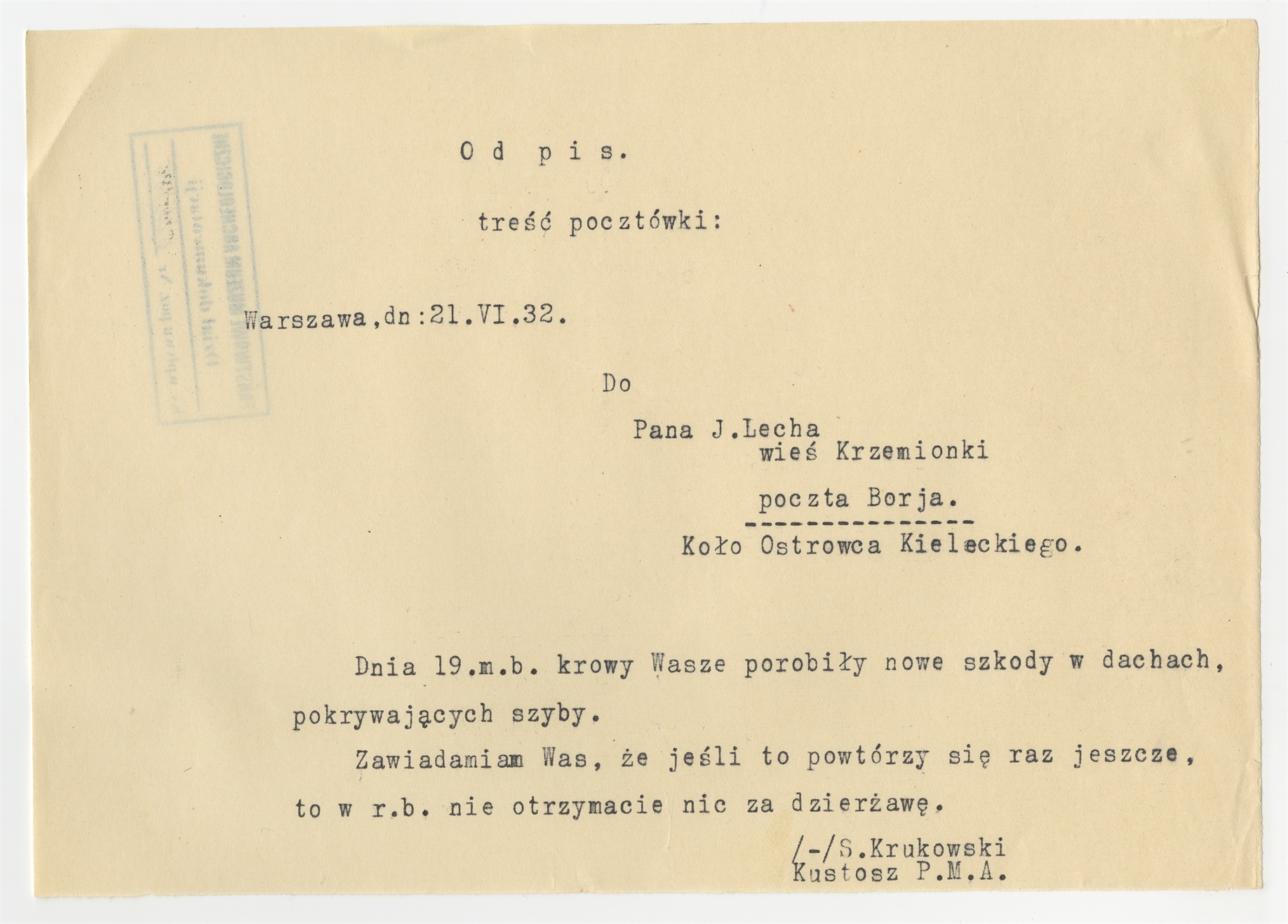 Maszynopis listu (odpis z pocztówki) prof. Stefana Krukowskiego do J. Lecha z dnia 21 czerwca [19]32 r.