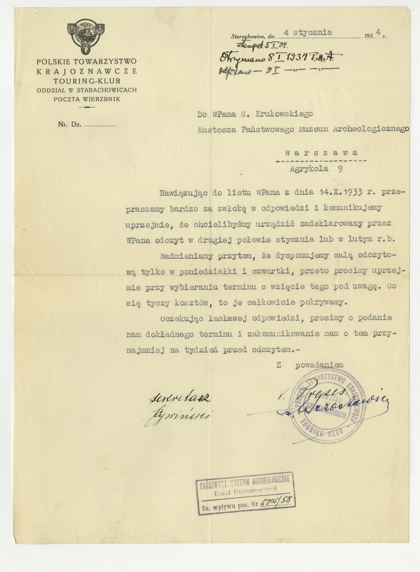 Maszynopis listu Polskiego Towarzystwa Krajoznawczego Touring - Klub do prof. Stefana Krukowskiego w sprawie organizacji odczytu Starachowice 4 I 1934 r.