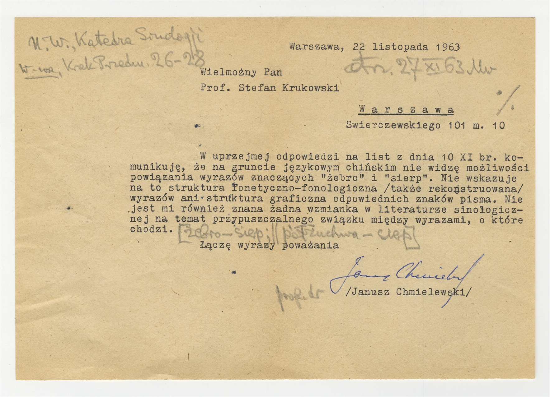 Maszynopis listu prof. Janusza Chmielewskiego z Katedry Sinologii UW do prof. Stefana Krukowskiego na temat braku możliwości powiązania na gruncie języka chińskiego znaczeń wyrazów "żebro" i "sierp" Warszawa 22 listopada 1963 - strona 1