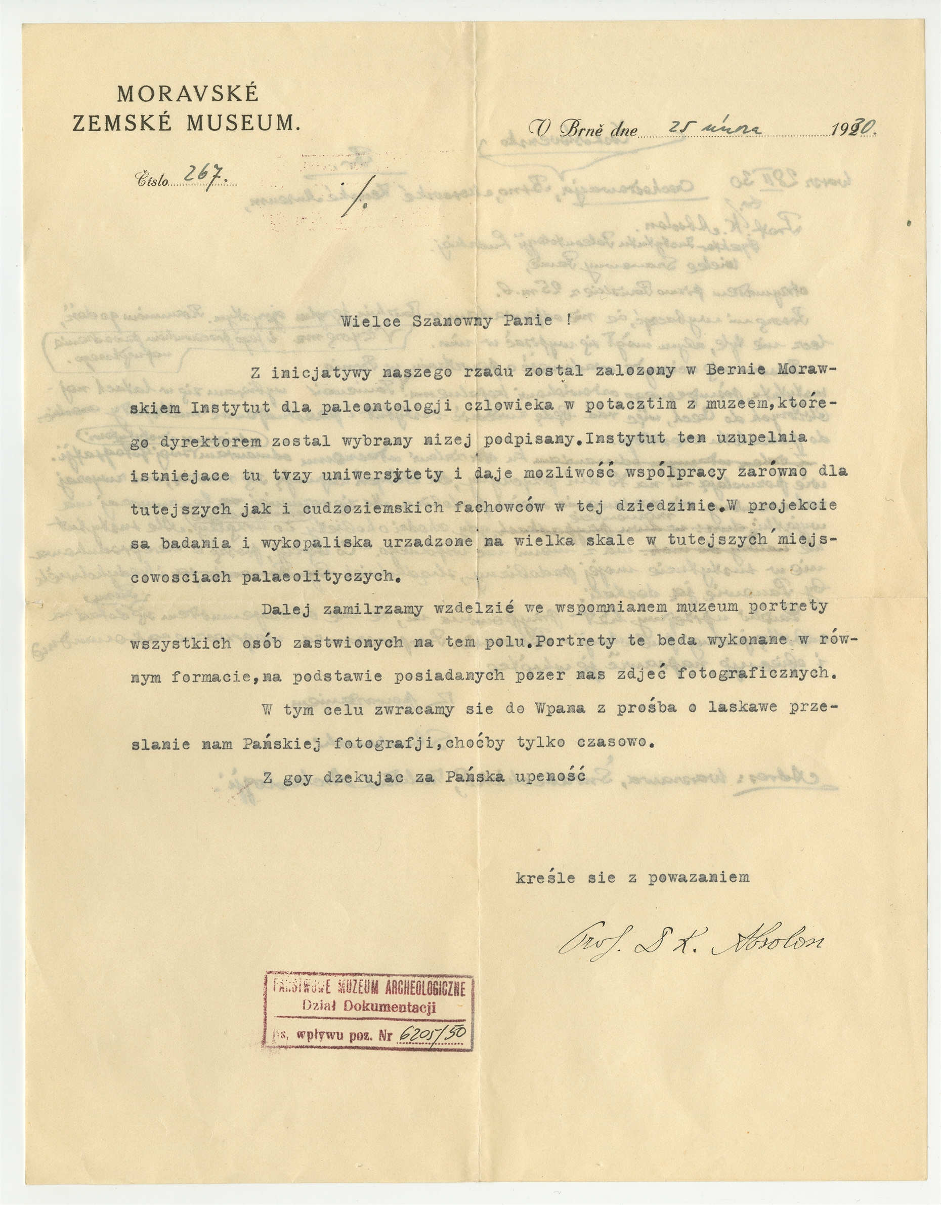Maszynopis listu prof. K. Absolon  Morawskie Muzeum Ziemi  z dn. 25 II 1930 r.