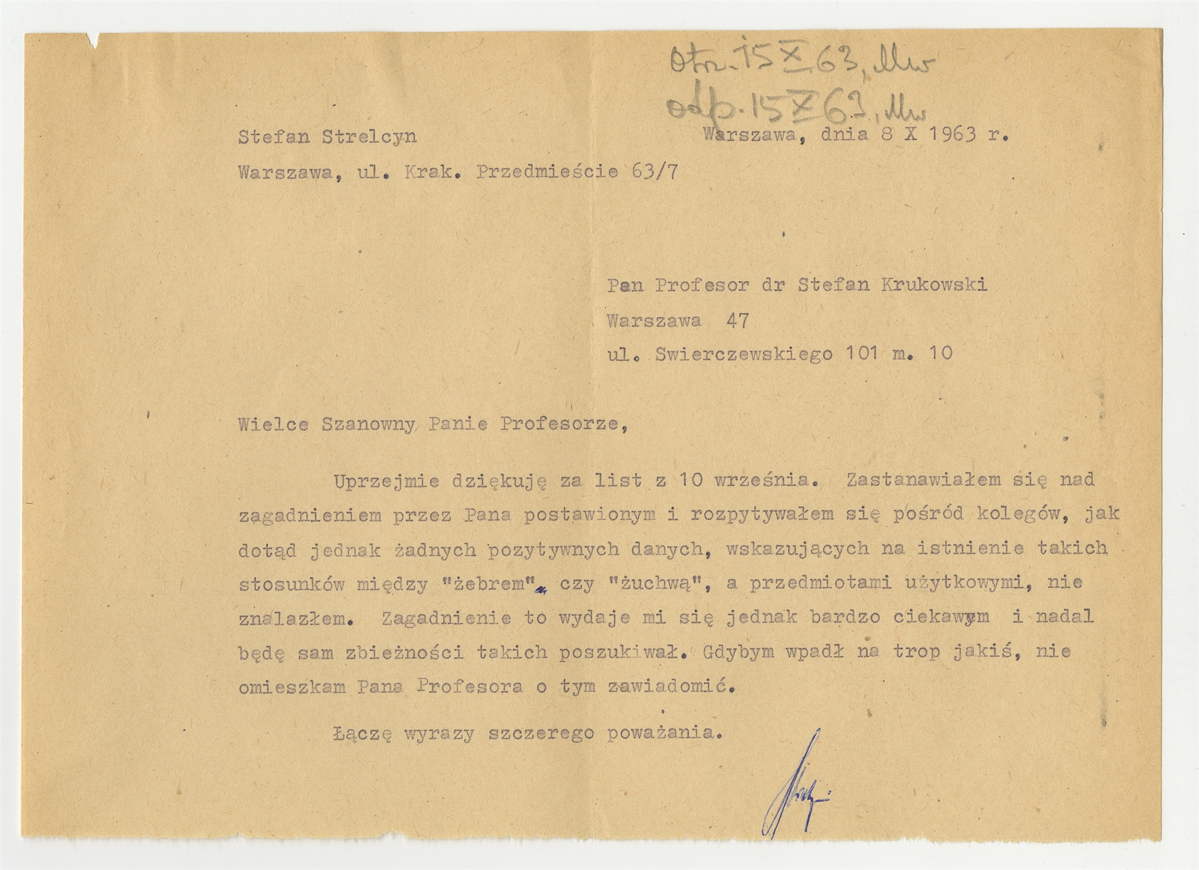 Maszynopis listu prof. Stefana Strelcyna z Zakładu Orientalistycznego UW do prof. Stefana Krukowskiego z informacją o braku znanych zbieżności etymologicznych między słowami "żebro" i "żuchwa" a nazwami przedmiotów użytkowych 8 X 1963 r. - strona 1