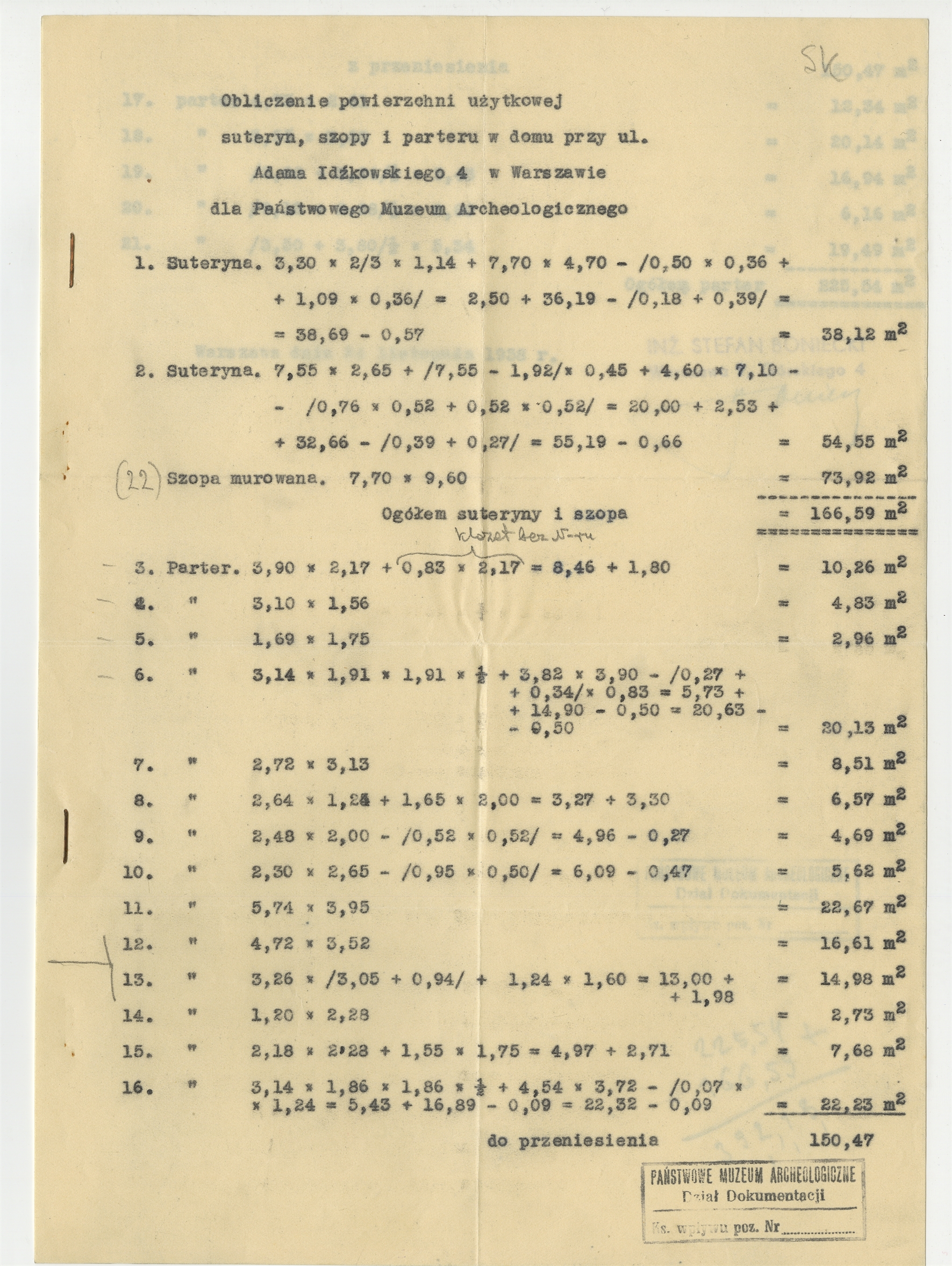 Maszynopis - obliczenie powierzchni użytkowej suteryn szopy i parteru w doomu przy ul. A. Idźkowskiego 4 w Warszawie z dnia 24 listopada 1938 roku