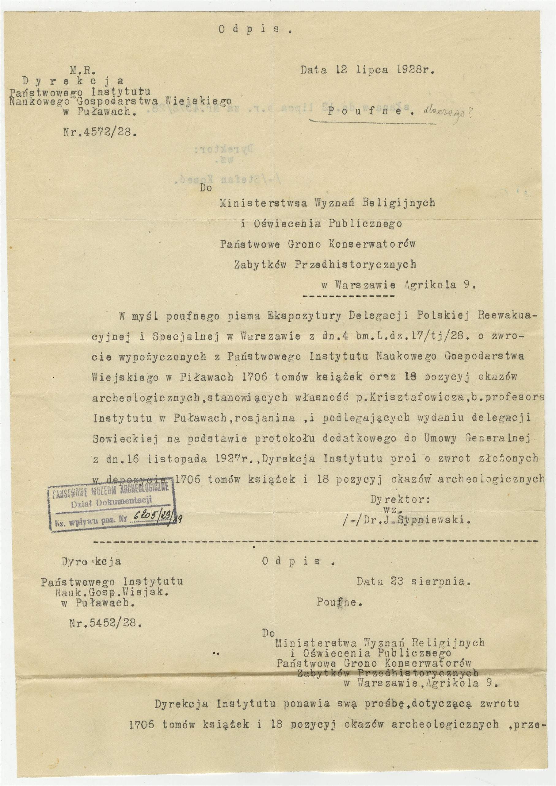 Maszynopis - odpis dwóch listów Dyrekcji Państwowego Instytutu Naukowego Gospodarstwa Wiejskiego w Puławach do Ministerstwa Wyznań Religijnych i Oświecenia Publicznego z dnia 12 lipca 1928 roku oraz z dnia 23 sierpnia [1928] roku