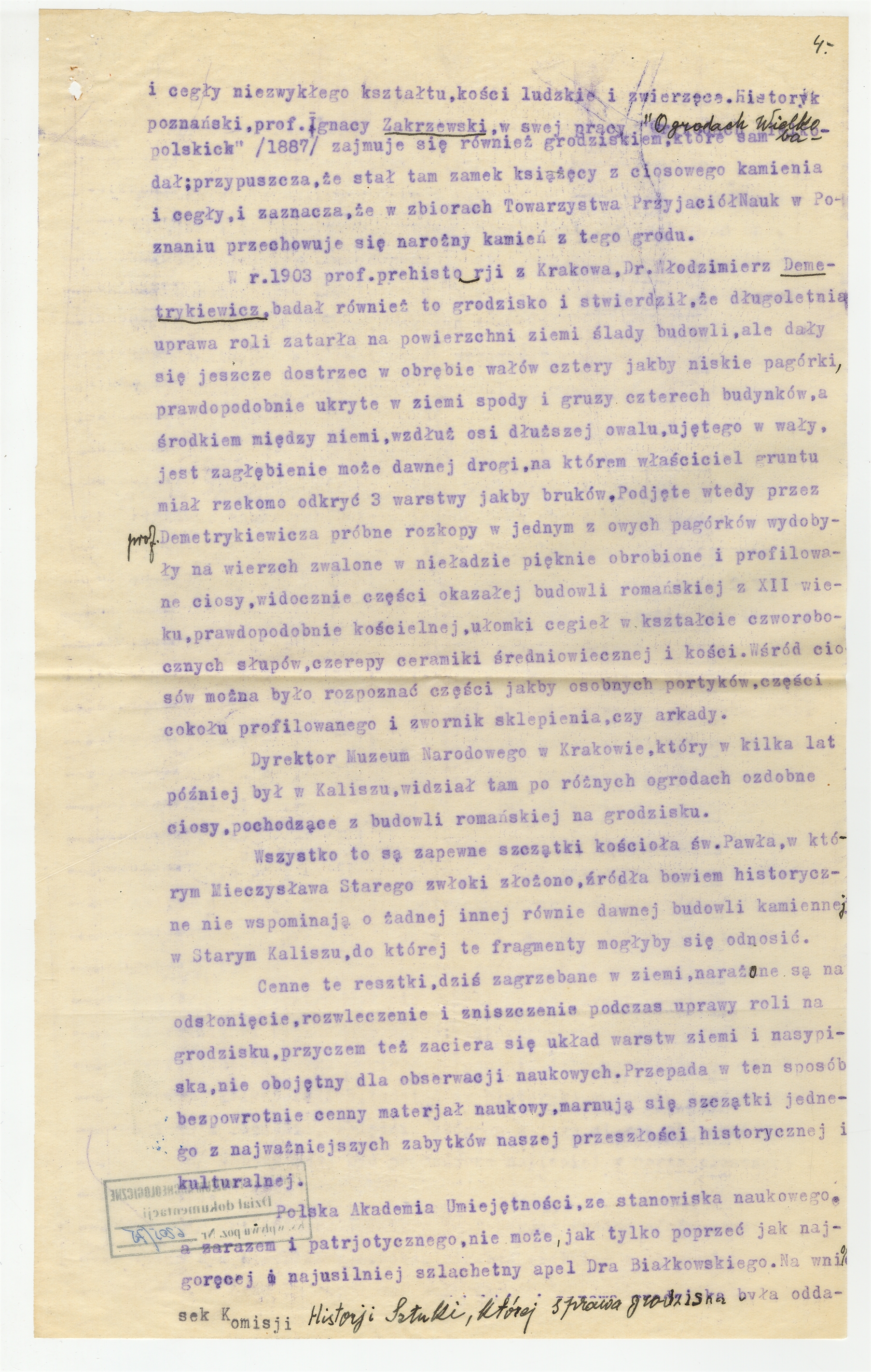 Maszynopis - odpis listu St. Wróblewskiego do Ministerstwa W.R.i O.P z dnia 22 marca 1921 roku dotyczący grodziska w Kaliszu (cd)