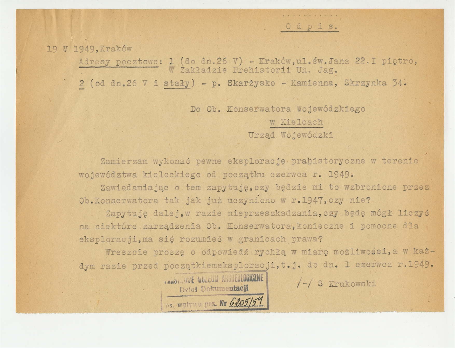 Maszynopis - odpis listu Stefana Krukowskiego do Konserwatora Wojewódzkiego w Kielcach z dnia 19 V 1949 roku - pierwszy egzemplarz