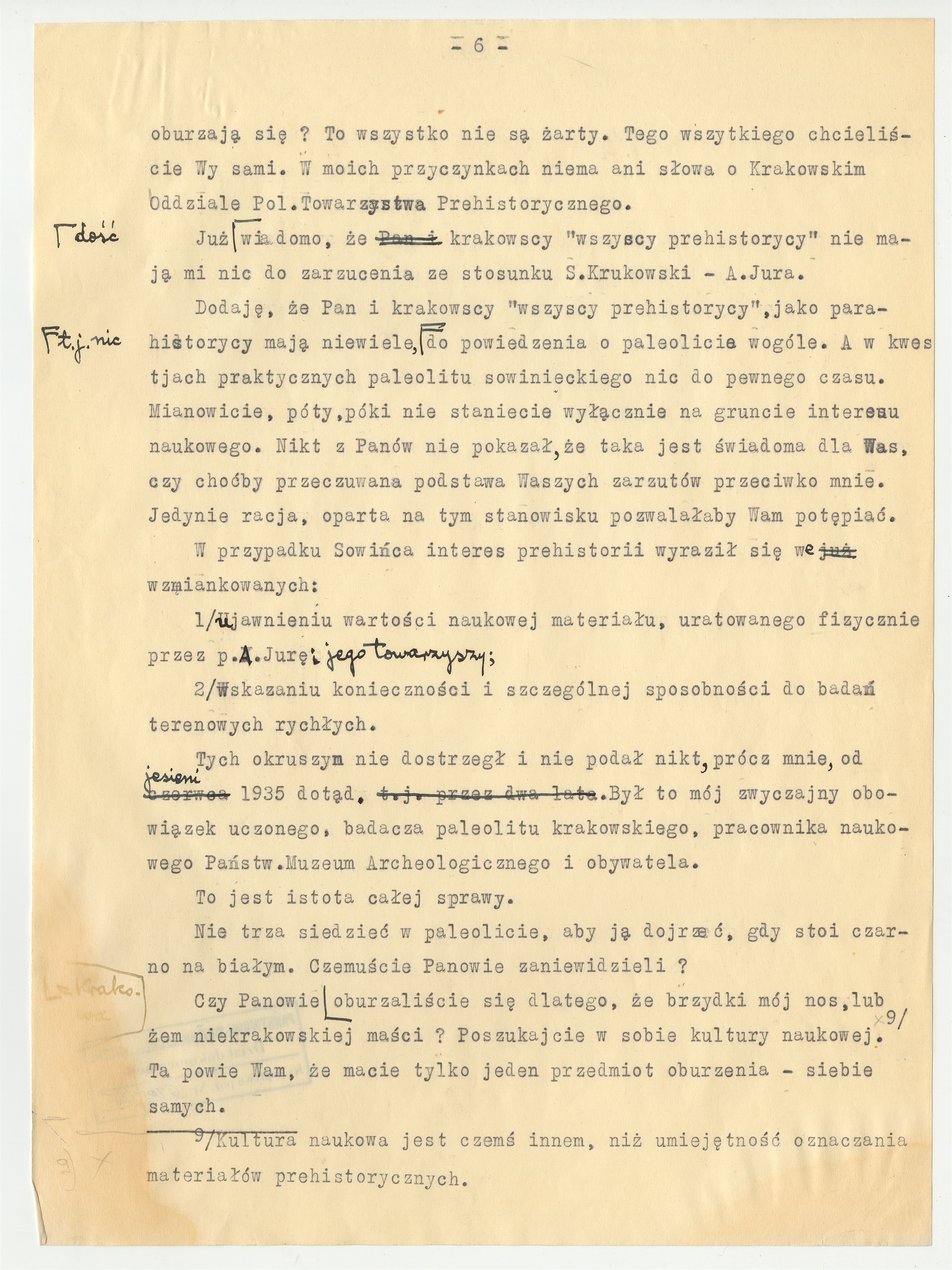 Maszynopis - odpis listu Stefana Krukowskiego do prof. J. Kostrzewskiego z dnia 20 czerwca 1937 roku dotyczącego Sowińca - egzemplarz przeznaczony dla H. Hoyera (PAU) - strona 6