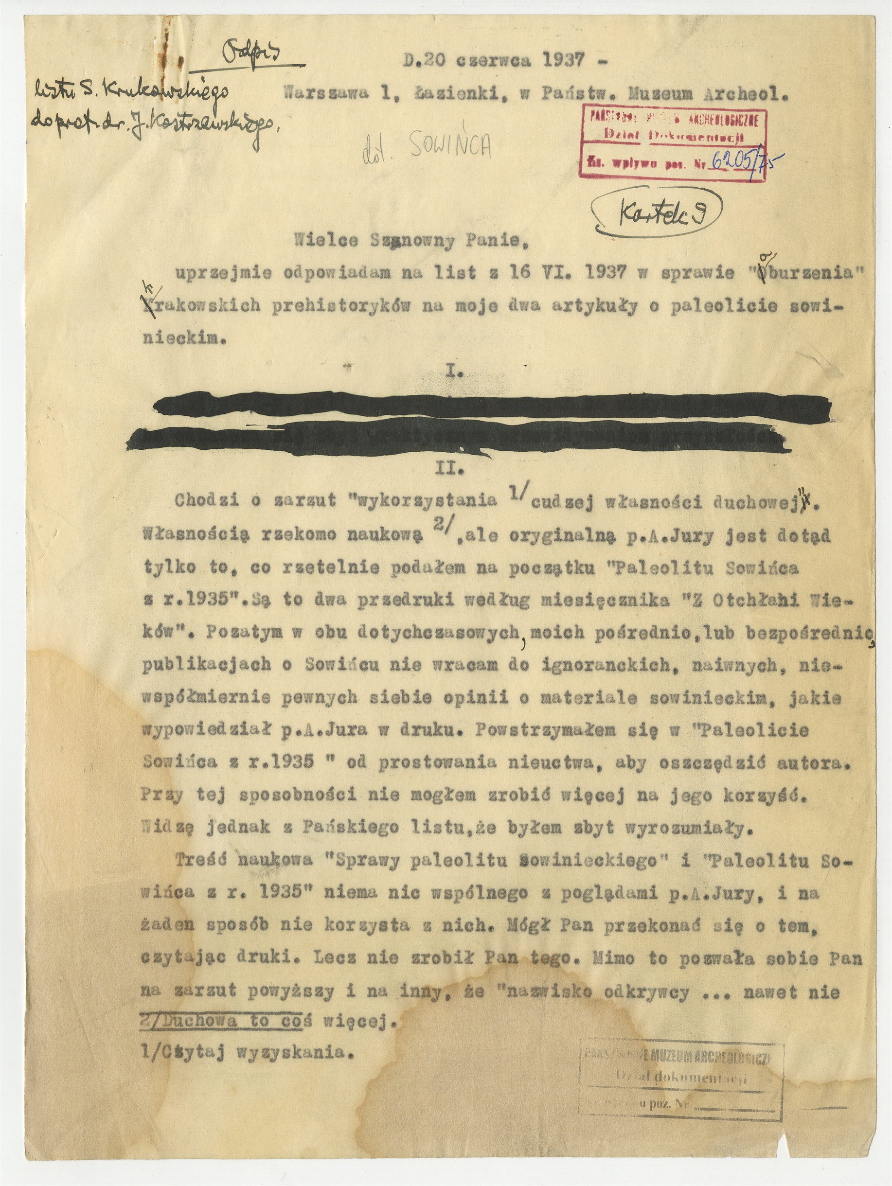 Maszynopis - odpis listu Stefana Krukowskiego do prof. J. Kostrzewskiego z dnia 20 czerwca 1937 roku dotyczącego Sowińca - strona 1