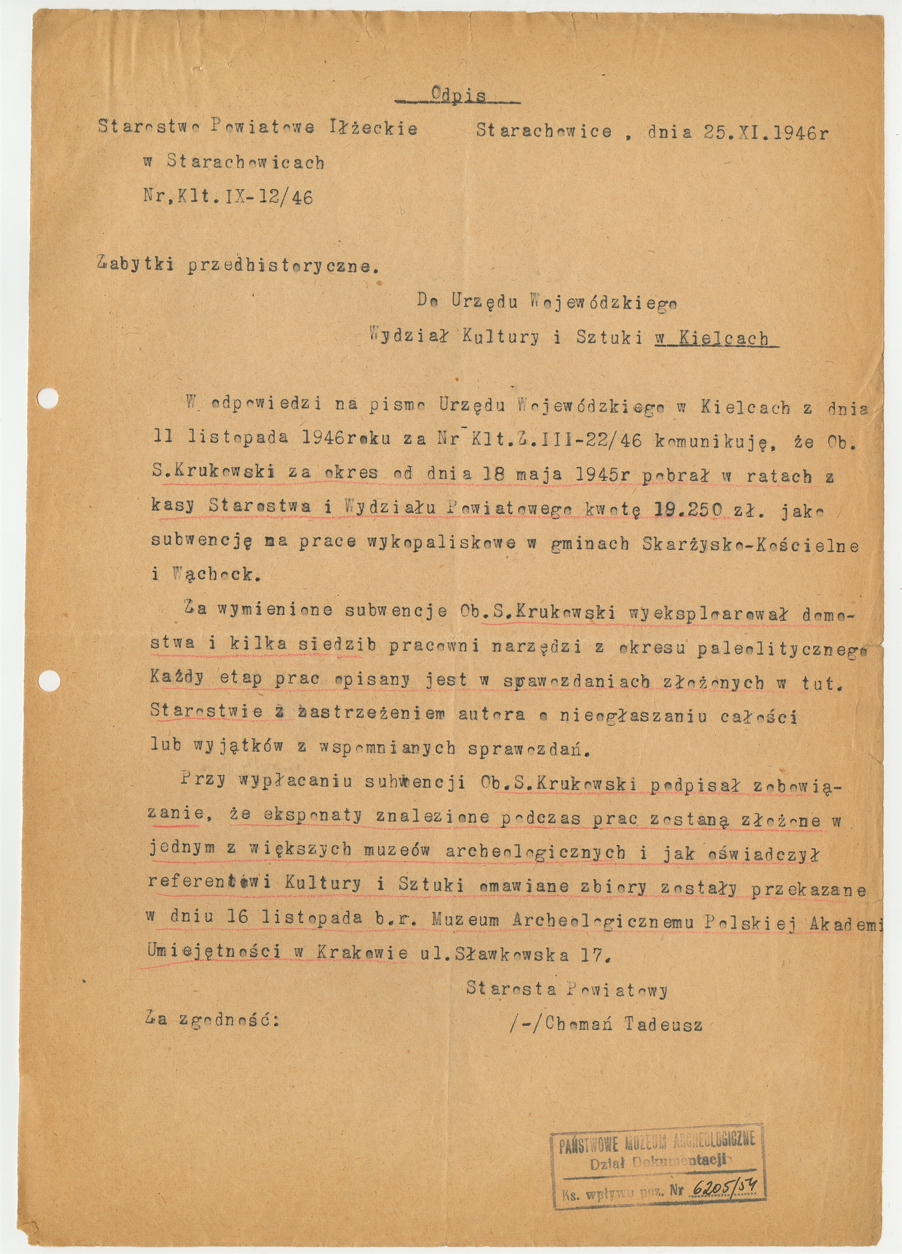 Maszynopis - odpis listu Tadeusza Chomonia do Urzędu Wojewódzkiego w Kielcach z dnia 25 XI 1946 roku