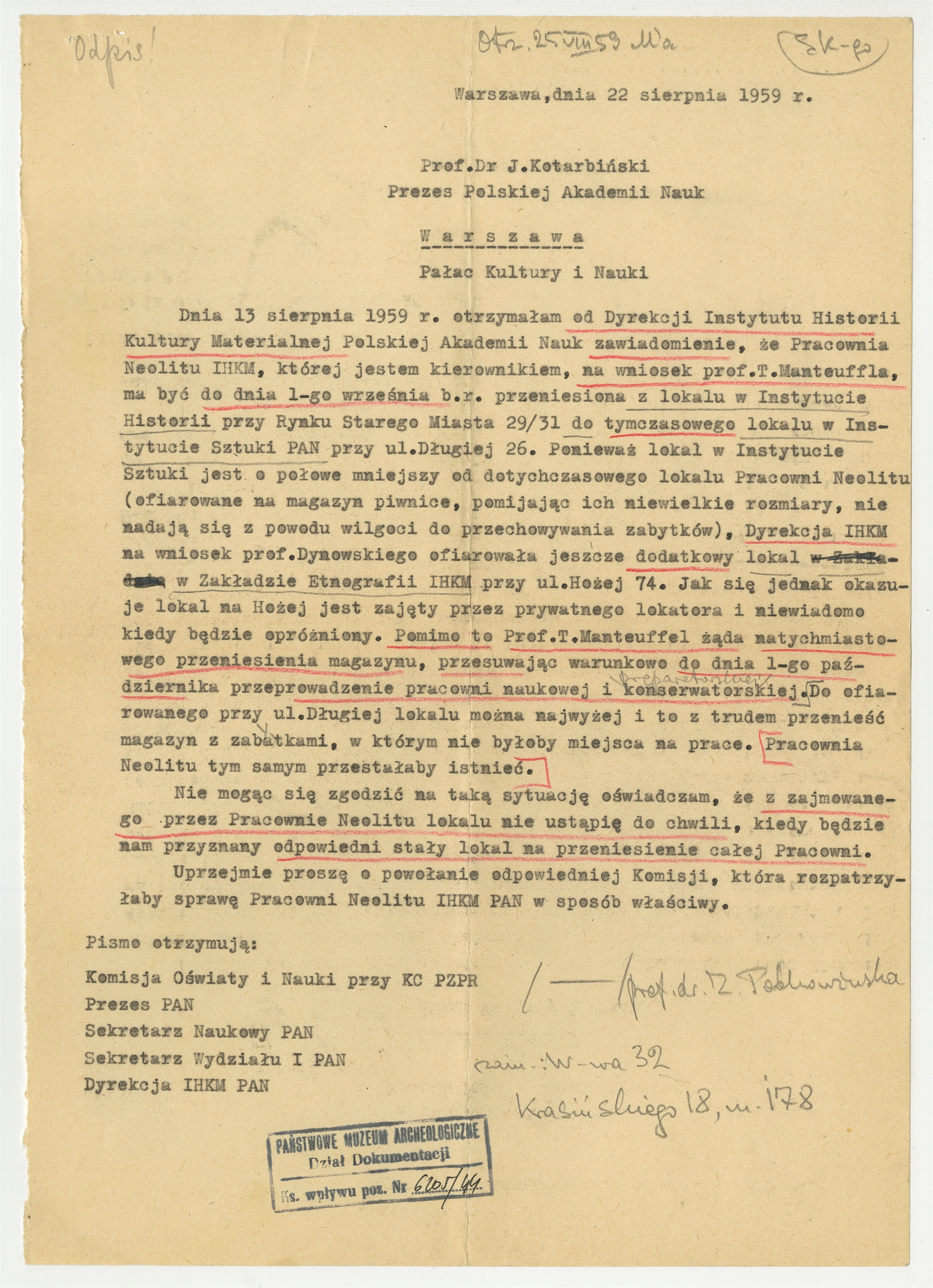 Maszynopis - odpis listu Zofii Podkowińskiej do J. Kotarbińskiego prezesa PAN z dnia 22 sierpnia 1959 roku