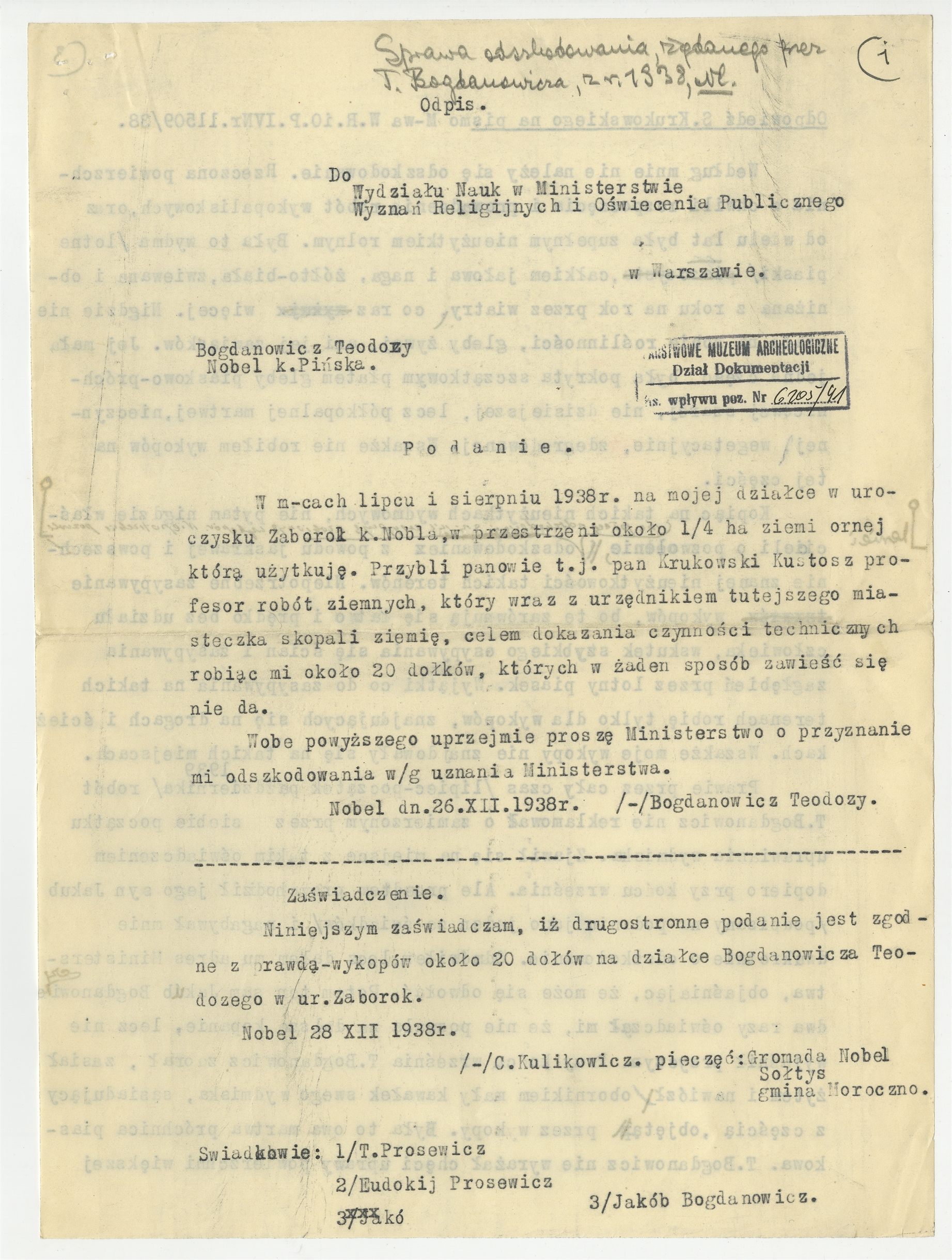 Maszynopis-odpis pisma Bogdanowicza Teodozego z dn 26 XII 1938 r. skierowane do Wydziału Nauk w Ministerstwie Wyznań Religijnych i Oświecenia Publicznego