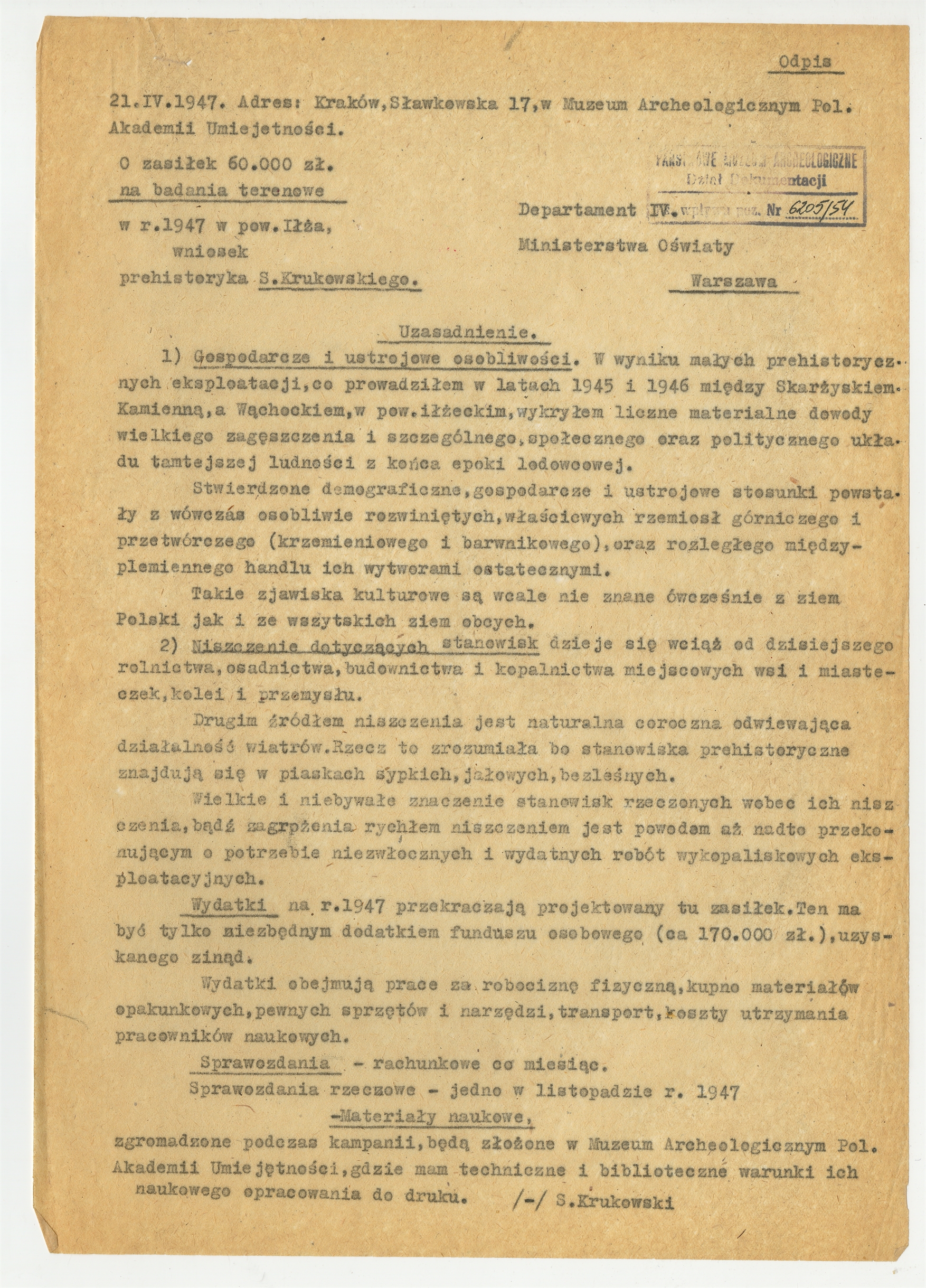 Maszynopis - odpis podania Stefana Krukowskiego o zasiłek na badania terenowe z dnia 21 IV [!] 1947 roku
